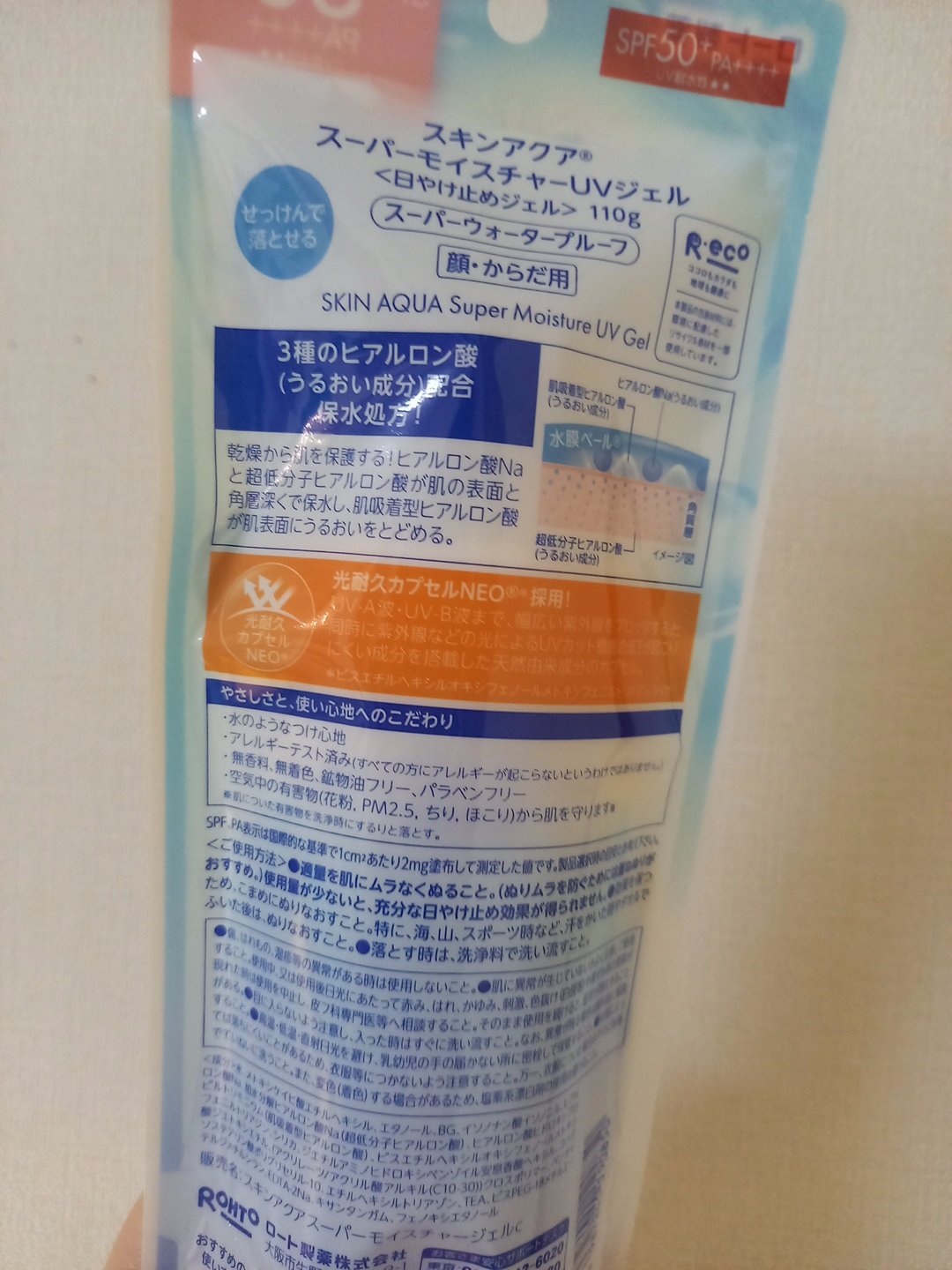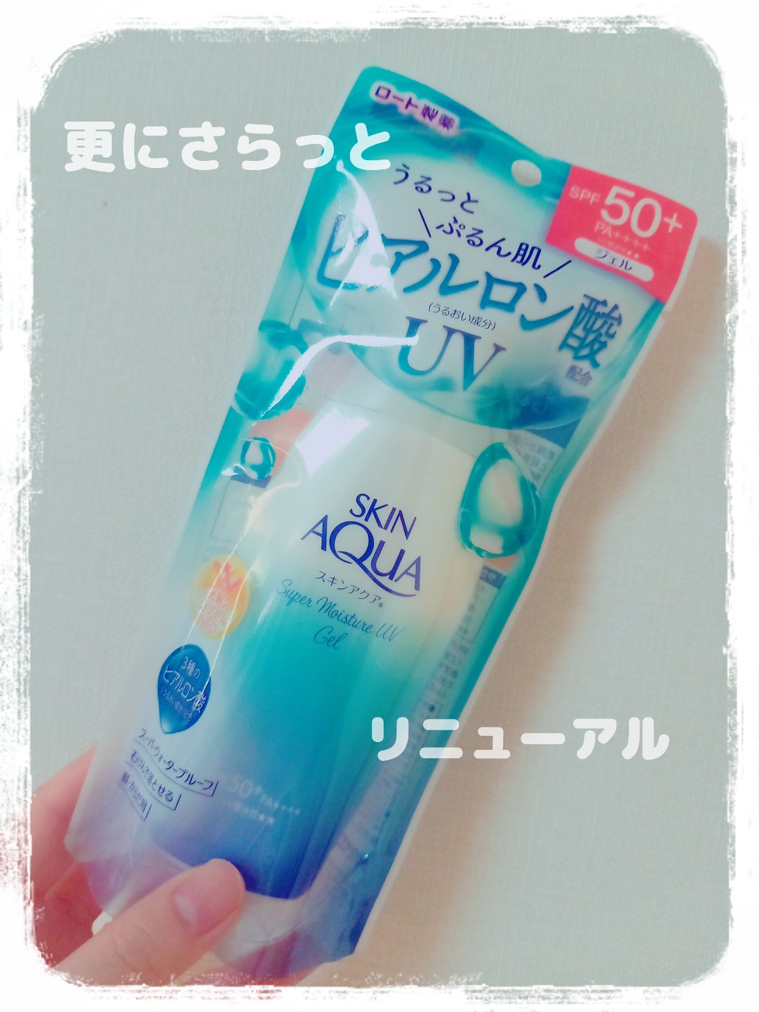 【スキンアクア】スーパーモイスチャージェルポンプタイプ購入しました。UV耐水性が書いてるので新しいバージョンかな?と思います。水のような軽いつけ心地で、ジェルタイプならではのうるおい感。顔にも身体にも使える万能UVで、SPF50+/PA+++...