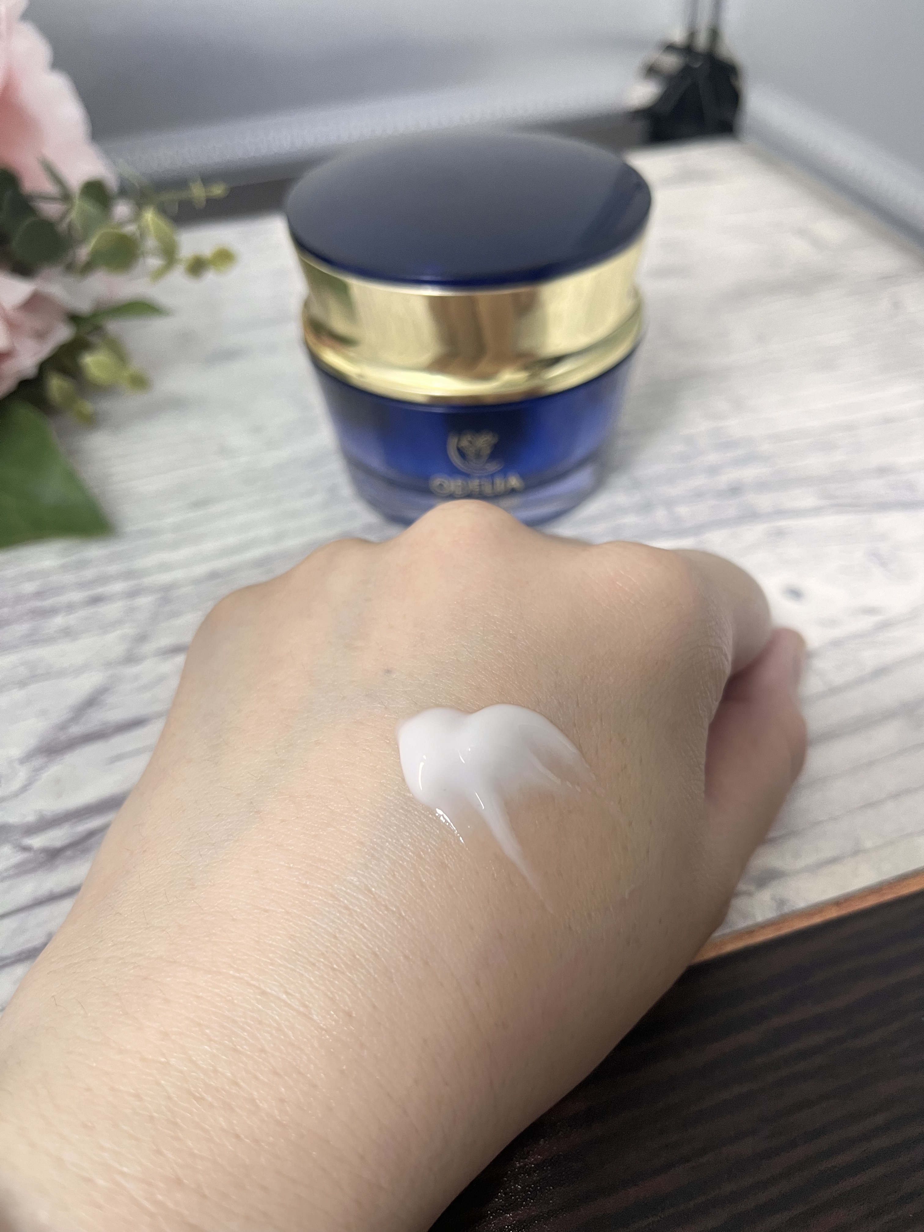 ディープブルーにゴールドの大人っぽいパッケージに入ったシワ改善、シミ予防のwの機能を兼ね備えたオールインワンクリームは、ゆるっとした乳液みたいな白いテクスチャーです。 みずみずしくしっとりするような使い心地で、香りは付いていないので、目元や鼻、口まわり、首までスキンケアしています。 50代の私が使っても手放したくなくなるような土台からのスキンケア。