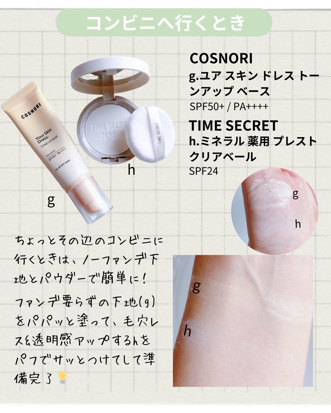 ノーファンデ下地としても使える下地とカバー力高めのクッションファンデ。同じシリーズだからなじみも良く、化粧崩れもしにくいよ🐰 肌がゆらいだり、敏感な時はこの組み合わせ!つけているのを忘れるくらい軽いつけ心地で、クレンジングも優しいもので落とせる🌿 ツヤ下地×マットファンデで今っぽい肌をつくれる組み合わせ。ジルのプライマーは単品でも綺麗に仕上がのでファンデは薄めに塗るのが良いかも☺️ ちょっとそこまでの外出はノーファンデ下地に毛穴レスパウダーで簡単仕上げているよ。パパッとできるところも嬉しい💖