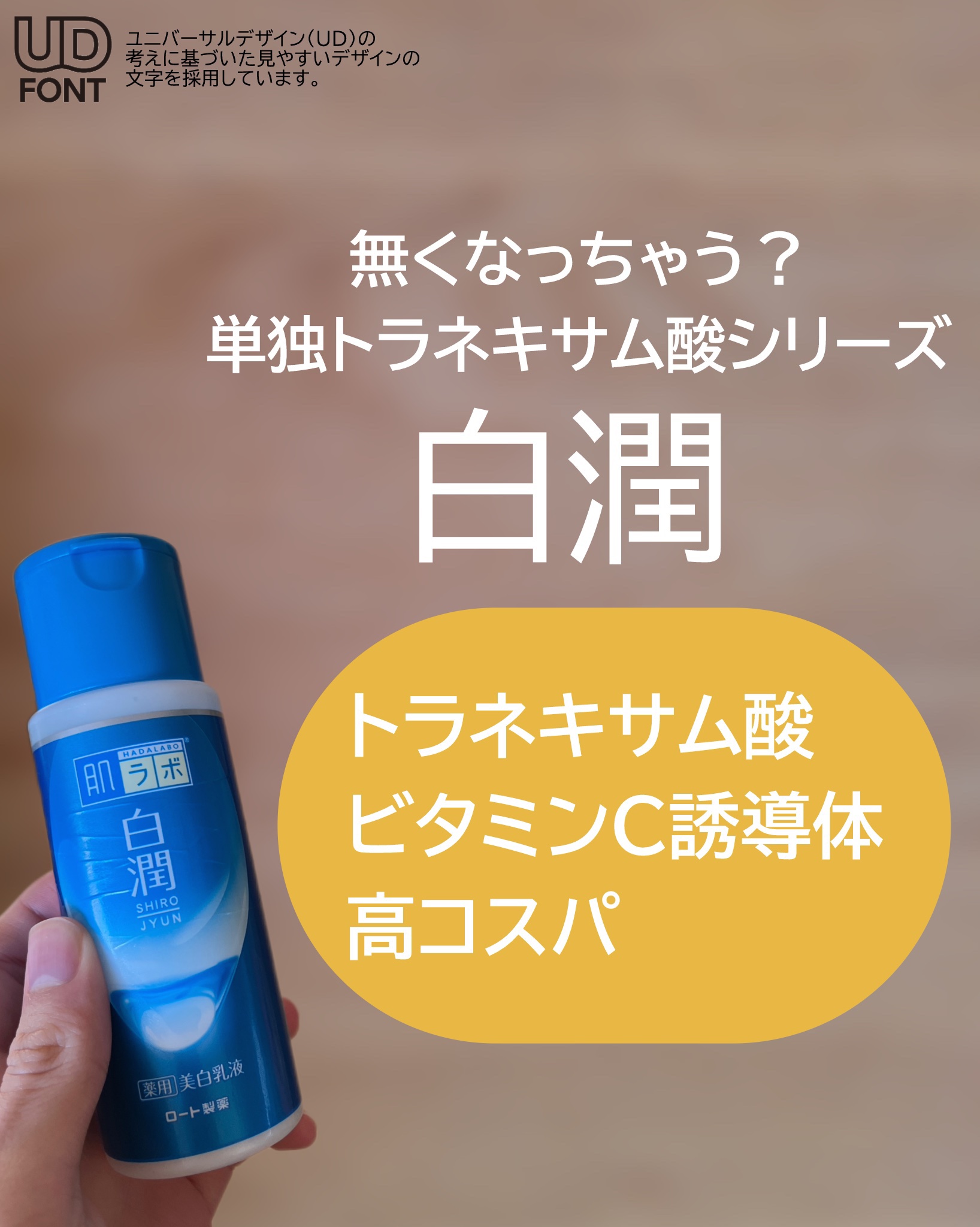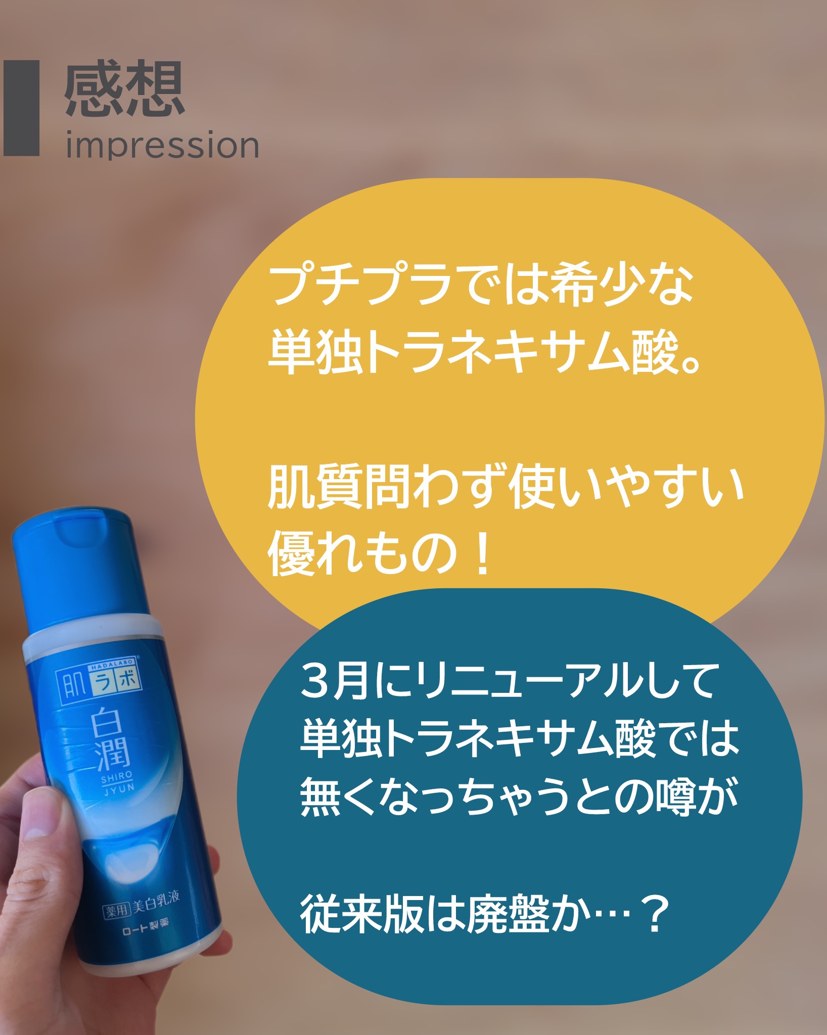 ニキビに悩む方にもおすすめできるアイテム これは本当にみずみずしいテクスチャーでサラッと浸透してくれるの!(角質層まで) 体の保湿は手早くやりたい派の私にぴったりだった 今くらい、5月くらいから夏の時期に合う保湿力かな しかもトラネキサム酸配合のアイテムを体に塗れるって嬉しいよね プチプラだから大胆にも使えるし、言うことなし! これからの時期、紫外線こわいよね。全身くまなく肌ラボ白潤 薬用美白シリーズにお任せしちゃお!!