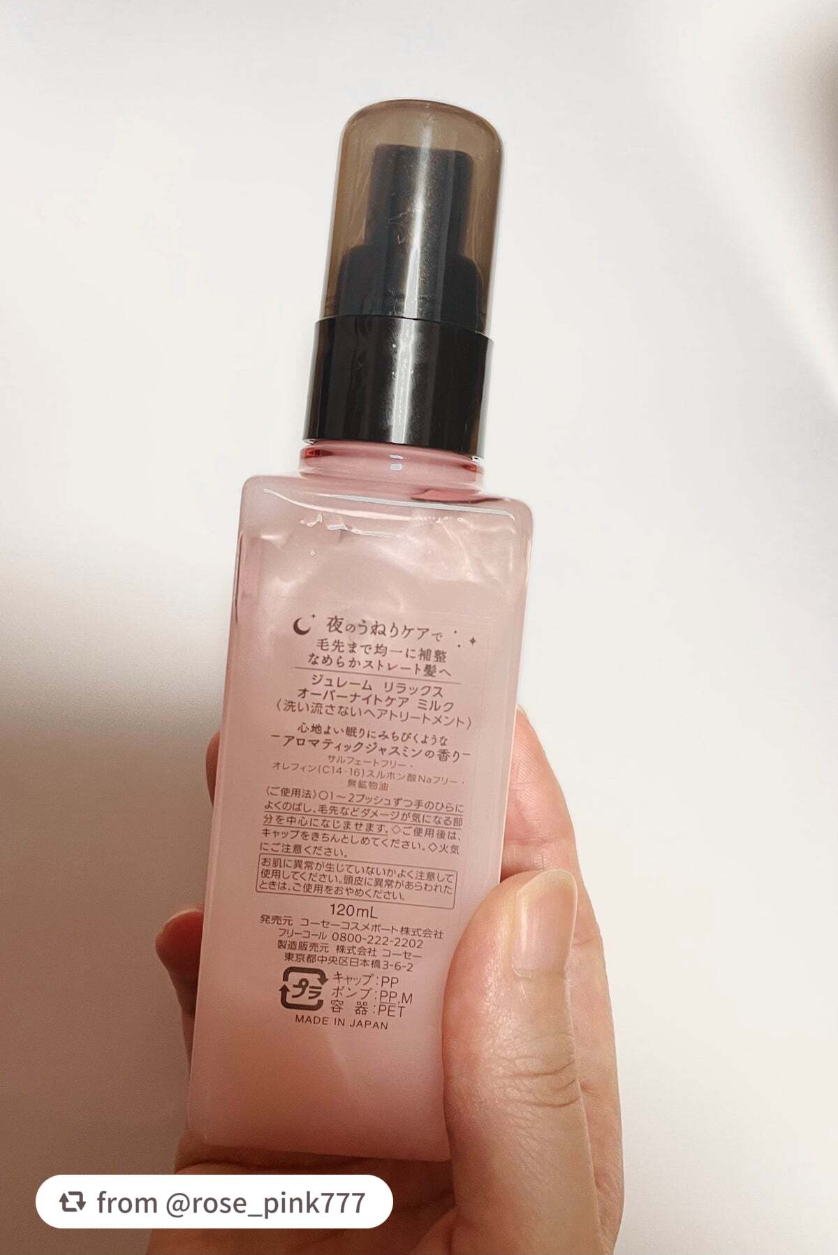 - 夜のうねりケアで扱いやすいストレート髪へみちびく 「ジュレーム リラックス」 ●うねりの原因に着目し、髪の内側からも外側からもアプローチ シルクキャップ効果で、素直にまとまる髪に ●毛先まで均一に補整してなめらかストレート髪へみちびくヘアミルク ●寝ている間も乾燥・摩擦から髪をまもる、まるで塗るシルクキャップ! ●眠る前のリラックスタイムに使いたい アロマティックジャスミンの香り