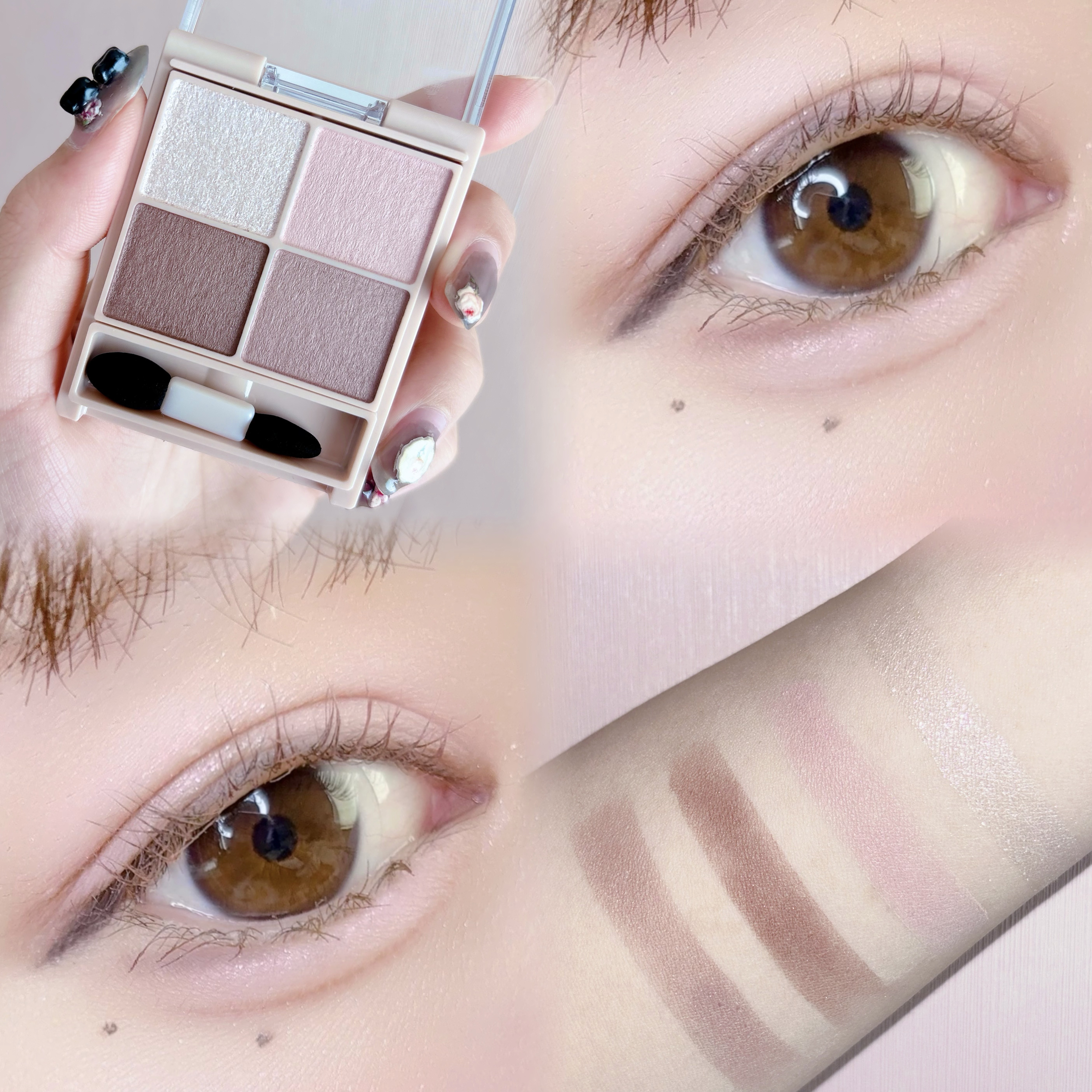 - シルキースフレアイズの姉妹品♡ 肌に溶け込むような透けマットシャドウ 透け感のある柔らかい仕上がりになるマット3色と、透け発色の繊細ラメ1色のパレットシャドウ♡ 完全マットアイや、ラメ×マットアイなど、メイクのパターンを楽しみましょう!