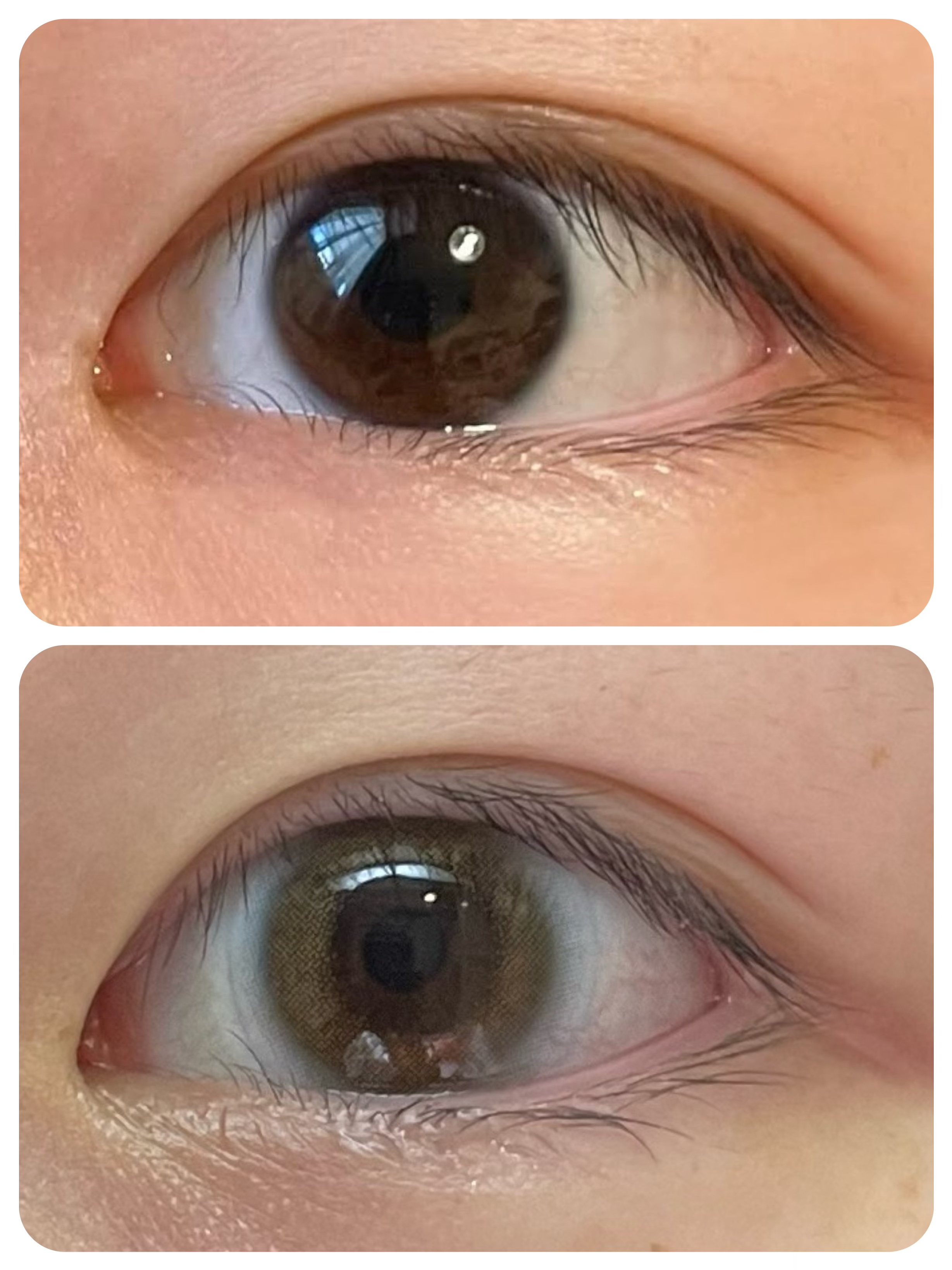 水光コンタクトのブラック 中と色の差があまりないからフチは目立たない、輪郭がはっきりする程度 ベルベージュよりも水光感は目立たなくてよりナチュラル OLENS グローイのブラックに似てる