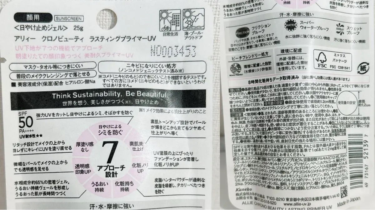 - 顔用日やけ止めジェル UV下地が7つの機能でアプローチ 朝塗りたての顔印象つづく。美耐久プライマーUV ●7アプローチ設計 【日やけによるシミを防ぐ】強力UVをカットし日やけによるシミ・ソバカスを防ぐ。 SPF50・PA++++・UV耐水性★★ 【素肌美仕上げ】素肌トーンアップ設計でパールが輝きどこから見てもツヤめく仕上がりへ導く 【化粧ノリUP】UV塗膜の上にぴったりファンデーションが密着し化粧ノリがUP 【化粧持ち持続】皮脂ハンターパウダーが過剰な皮脂を吸着し、テカリ・べたつきを防ぐ 【うるおい持続】水相成分約65%の密着ジェル。うるおい持続ヴェールを形成し、うるおった肌が長時間つづく 【透明感UP】微細なパールでメイクの上からでも透明感を足せる 【厚塗り感なし】リタッチ設計でメイクの上からヨレずにキレイにUVを塗り直せる ●マスク・タオル等につきにくい ●ニキビになりにくい処方(ノンコメドジェニックテスト済*2) *2 コメド(ニキビのもと)のできにくいことを確認するテストです。すべての方にコメド(ニキビのもと)ができないというわけではありません。 ●普段のメイククレンジングで落とせる ●美容液成分(保湿)配合 ヒアルロン酸Na ●汗・水・摩擦に強い 【フリクションプルーフ】日常のこすれ・摩擦に強く落ちにくい機能 【スーパーウォータープルーフ】水に抜群に強く落ちにくい機能 【スウェットプルーフ】汗に強く落ちにくい機能 ●ビーチフレンドリー処方 環境に配慮した設計(水環境リスク評価済み) ●環境に配慮 外装・容器には環境に配慮した素材を使用しています。FSC認証 ●8時間化粧持ちデータ取得済み(当社調べ。効果には個人差があります)