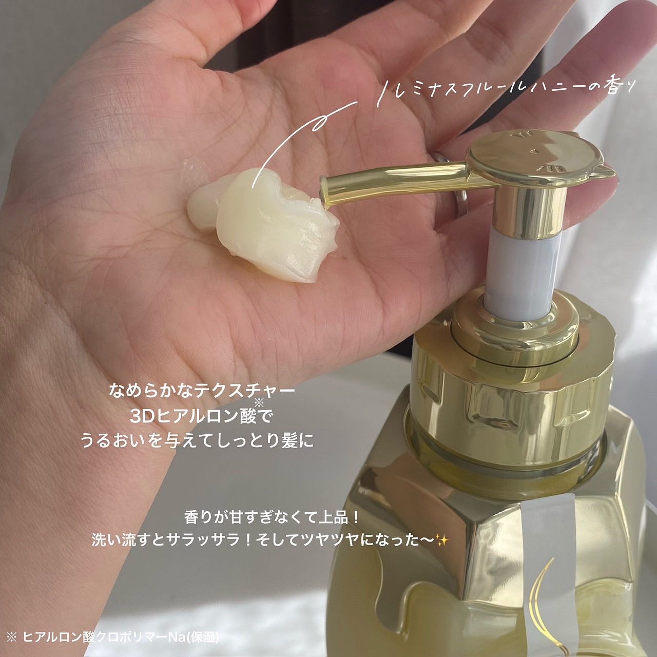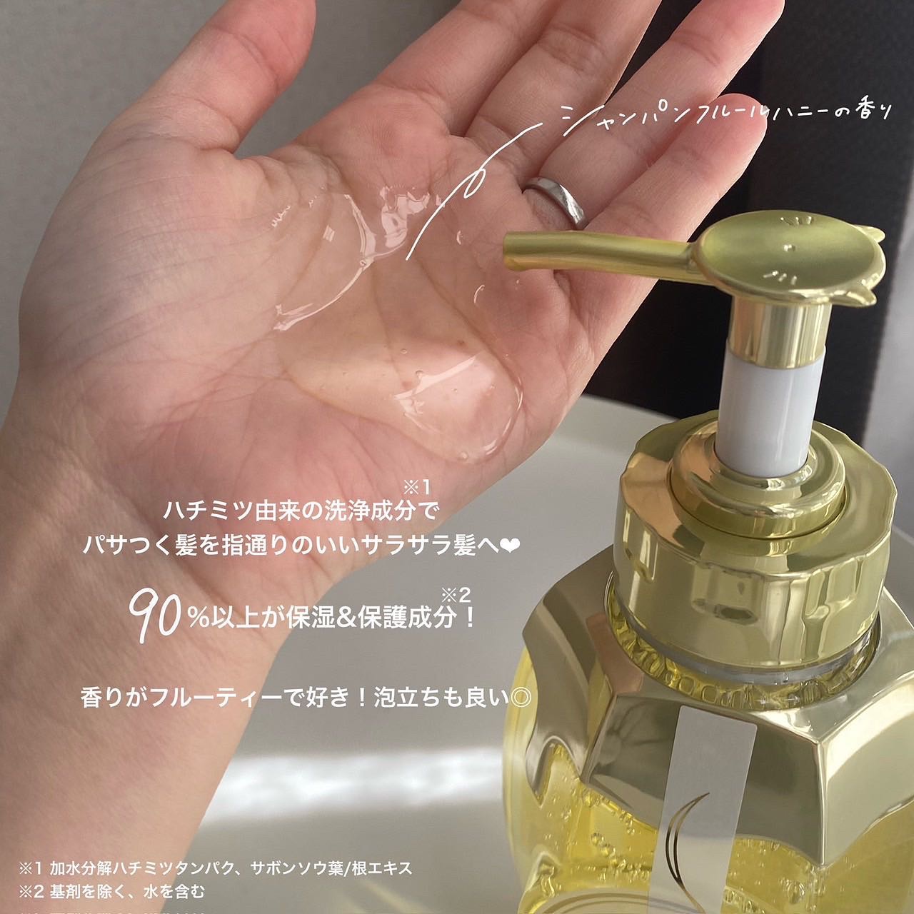 - 新しいハチミツ美容で、パサつきや猫っ毛をケアするシャンプー・ヘアトリートメント。 製品の90%以上をハチミツやゴールデンシルクなどの保湿&保護成分で構成し、さらにカシミヤシルク成分を配合し毛先まで指通りの良い髪へ導きます。 無添加フリー処方※。 シャンプー:シャンパンフルールハニーの香り ヘアトリートメント:ルミナスフルールハニーの香り。 ※サルフェート、パラベン、PG、鉱物油、動物実験フリー 2023年9月7日一部先行発売