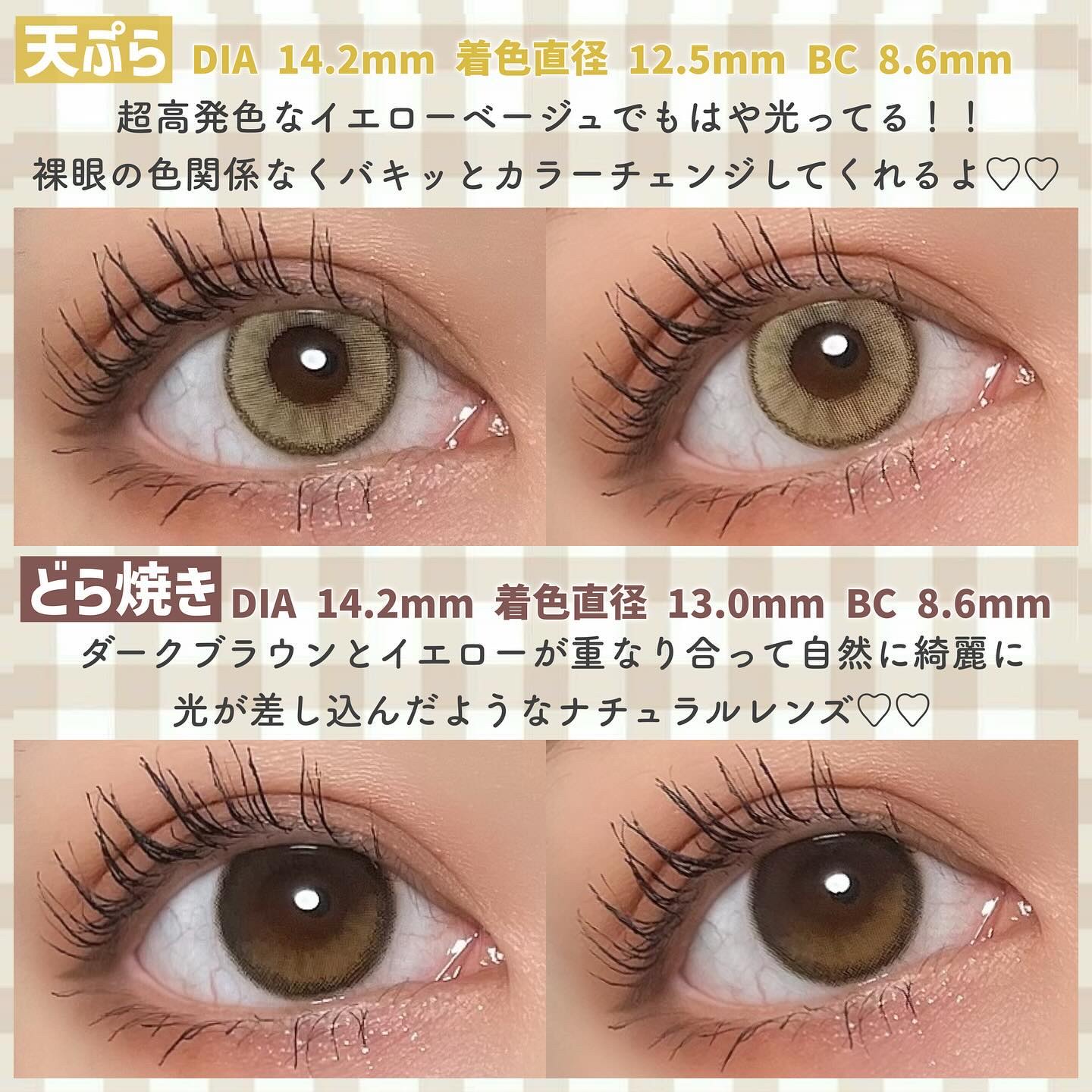 ダークブラウンとイエローのハイライトが綺麗な水光デザインのレンズ✨ ハイライトが瞳に光が差し込んだような輝きを与えてくれるよ☑️ 着色直径も大きすぎないサイズ感だから、ナチュラルに盛りたい日や日常使いにおすすめです! 【どら焼き】というカラー名もかわいい🫶