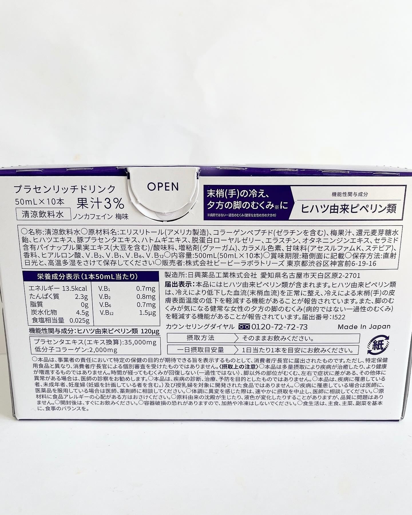 - 【機能性表示食品】 手先の冷え*1や、むくみ*2対策に。 手軽に飲める機能性表示食品(ドリンク)。 機能性関与成分「ヒハツ由来ピペリン類」のほか、カラダにうれしい多彩な成分、さらにBb lab. が誇る女性のための成分「プラセンタエキス」を35,000mg*3も配合。ノンカフェインで、すっきりと飲みやすい梅味。 【機能性関与成分 : ヒハツ由来ピペリン類 120μg】 ヒハツ由来ピペリン類は、冷えにより低下した血流( 末梢血流) を正常に整え、冷えによる末梢( 手) の皮膚表面温度の低下を軽減する機能があることが報告されています。また、脚のむくみが気になる健常な女性の夕方の脚のむくみ( 病的ではない一過性のむくみ) を軽減する機能があることが報告されています。 【カラダにうれしい成分】 ■プラセンタエキス(エキス換算)35,000mg ■低分子コラーゲン(コラーゲンペプチド) ■低分子ヒアルロン酸(ヒアルロン酸) ■エラスチングルコシルセラミド(セラミド含有パイナップル果実エキス) ■ヨクイニンエキス(ハトムギエキス) ■ローヤルゼリーエキス(脱蛋白ローヤルゼリー) ■ビタミンB群 ■高麗人参エキス(オタネニンジンエキス) *1 冷えによる末梢(手)の皮膚表面温度の低下 *2 健常な女性の夕方の脚のむくみ(病的ではない一過性のむくみ) *3エキス換算 ※画像はイメージです