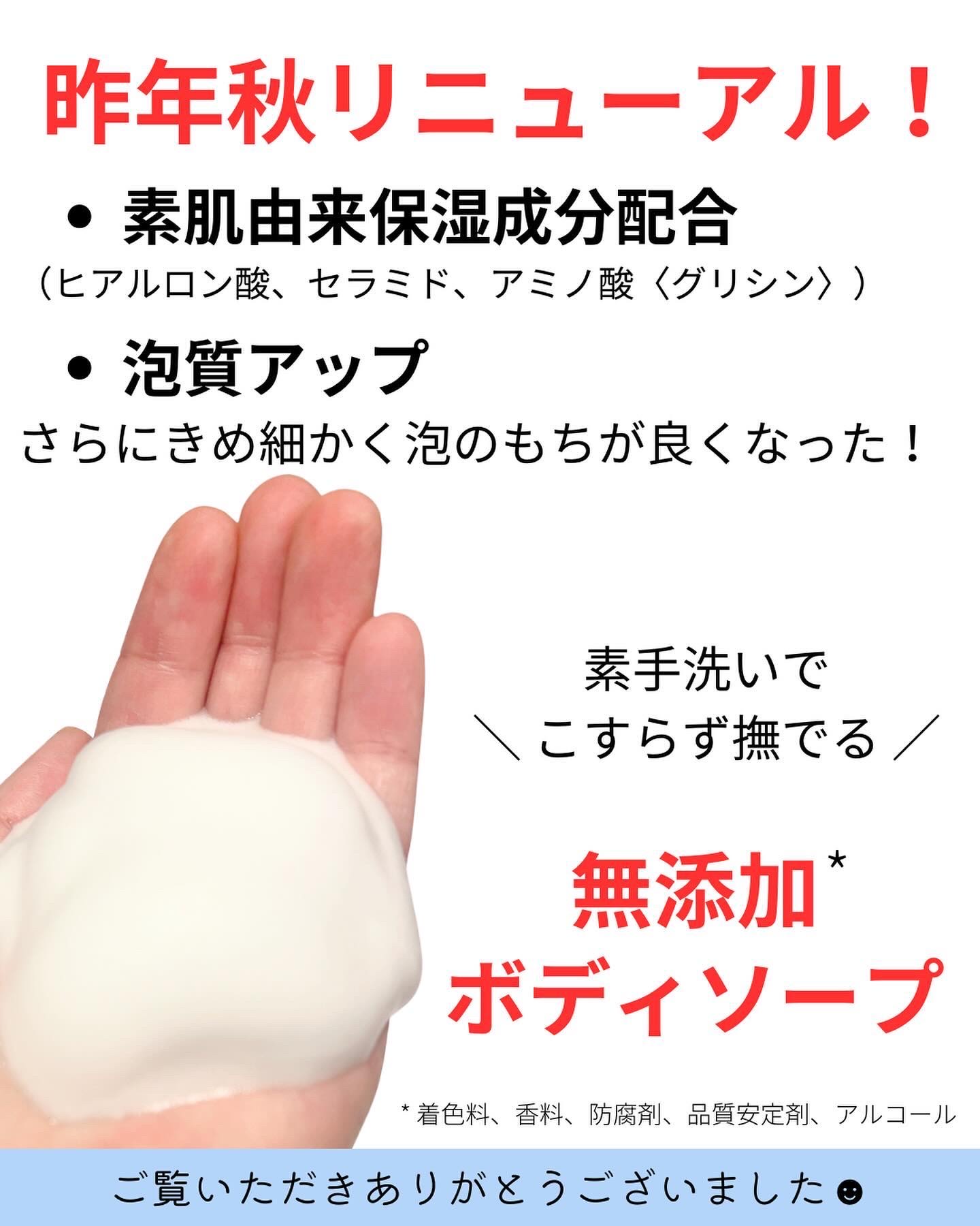 - 天然由来石けん成分と、お肌にやさしい使い心地の天然由来アミノ酸系洗浄成分配合。のびのよいクリーミィな泡がたっぷり出てくるので、お肌をこすらず、素手でなでるようにやさしく洗えます。 素肌由来保湿成分配合。 素肌由来保湿成分:セラミド・ヒアルロン酸・アミノ酸 (※グリシン) ※2023年9月11日リニューアル発売