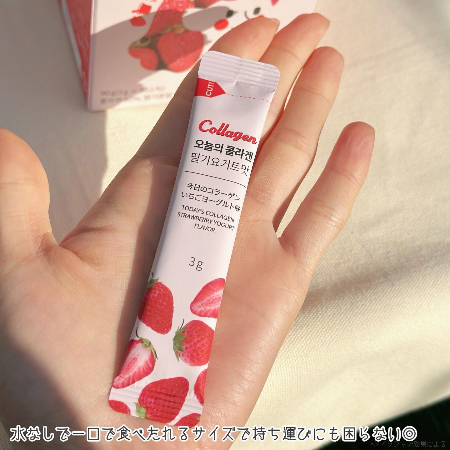 吸収率が高い超低分子フィッシュコラーゲンなんと195da! Lシステイン、ビタミンCまで配合🍋 この1包でぷるぷるなお肌に導いてくれるんだとか! 私が選んだのはイチゴヨーグルト味🍓 甘酸っぱくて粉っぽさもなく 水なしでそのまま飲んでも美味しいし ヨーグルトやアイスにかけても◎ フレーバーも6種類あって 抹茶ラテ味、イチゴヨーグルト味、桃ヨーグルト味、シャインマスカット味、ソルティキャラメル味、ヨーグルト味と豊富✨