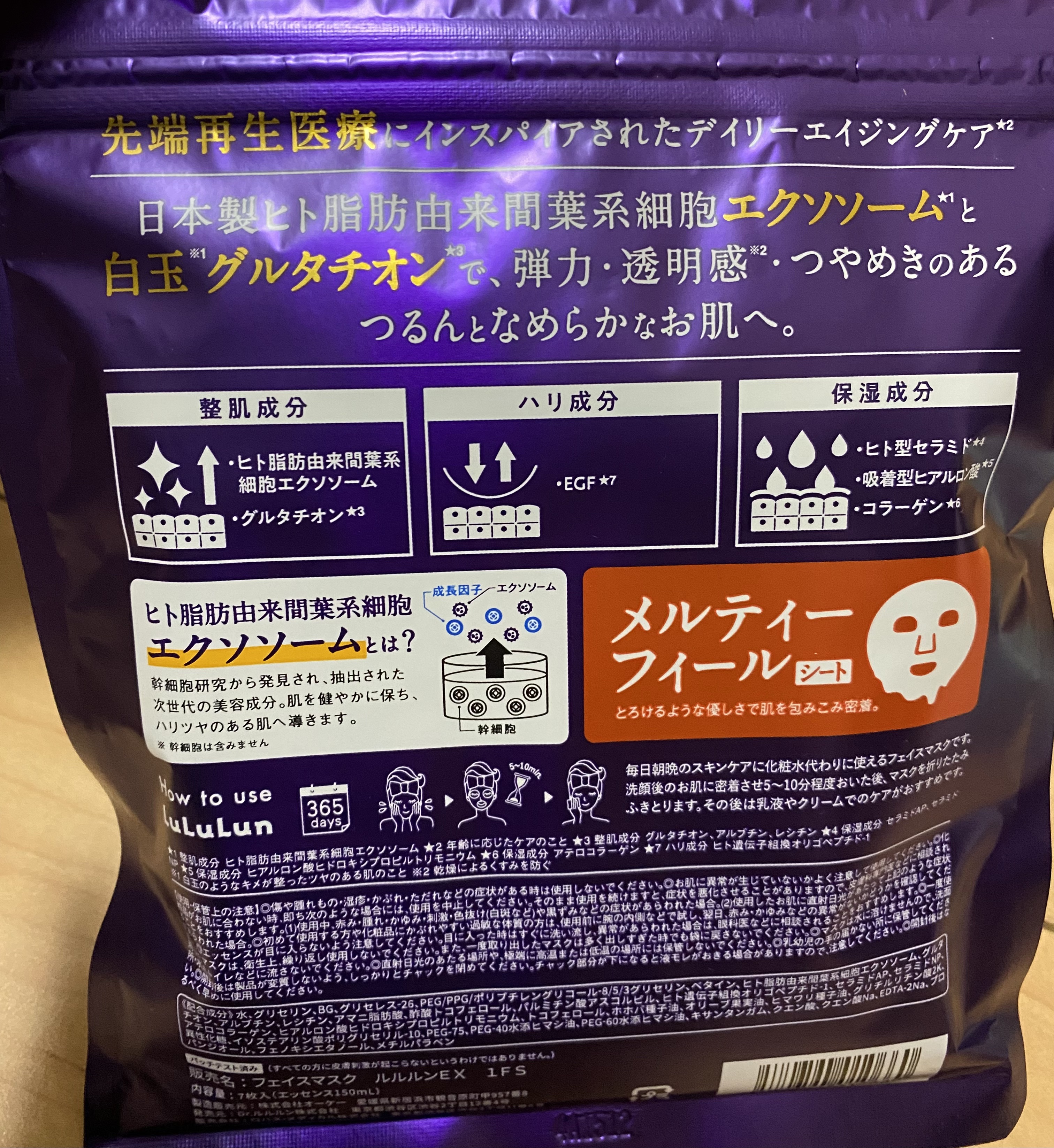 - ルルルンハイドラシリーズから新登場。うるおいにプラスするのは、「エクソソーム*1」。先端再生テクノロジーにインスパイアされた、デイリーエイジングケア※1マスクです。白玉※2グルタチオン*2をプラス配合し、弾力・透明感※3・つやめきのあるなめらかなお肌へ導きます。 (*1 整肌成分 ヒト脂肪由来間葉系細胞エクソソーム *2 整肌成分 グルタチオン、アルブチン、レシチン ※1 年齢に応じて肌へうるおいと弾力を与えるケアのこと ※2 白玉のようなキメが整ったツヤのある肌のこと ※3 うるおいを与えて、乾燥によるくすみを防ぐ)