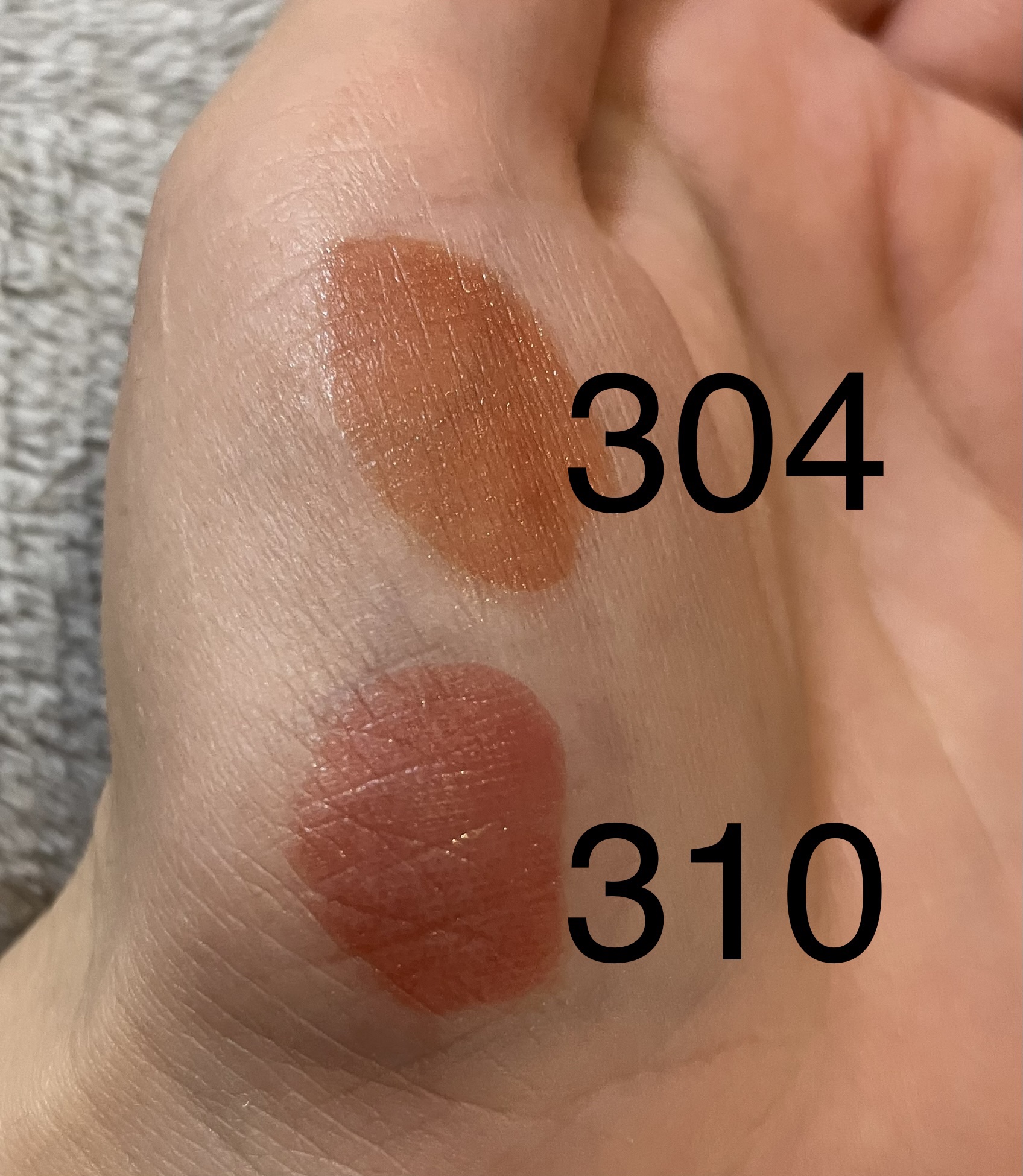とれてきても唇同士がくっつく感じというか、ムチムチ感が残ります。 色残りがいいので朝塗って、お直しは別の薄めのリップを上から塗るといった使い方をしてます。 1番ナチュラルなコーラルピンクは303ですが、お気に入りは306です。 私の唇には306の白みがある感じがあってました。 こちらは薄ーく塗ればブルベの私でもいけそうでした。 310はオレンジ感より赤みを強く感じました。
