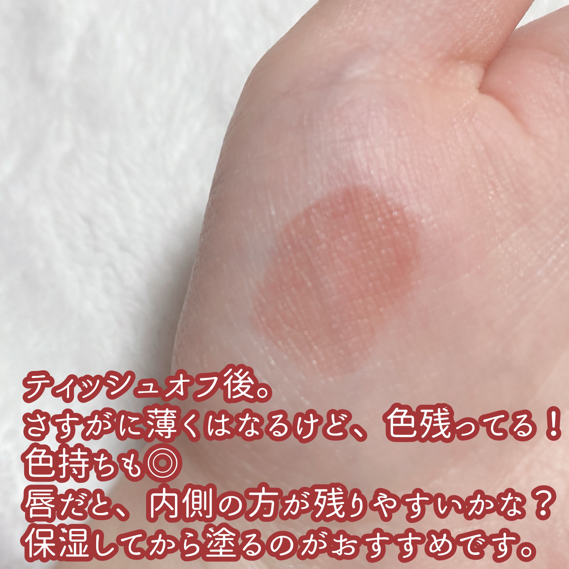 時間が経つと赤みが増して、血色感がとってもいい感じ! さらっと塗ると、肌なじみの良いカラーで、 重ねて塗ると、少し深めのブラウンレッドに。 それでもこっくりしすぎてないから、 すごく使いやすいブラウンリップでした!