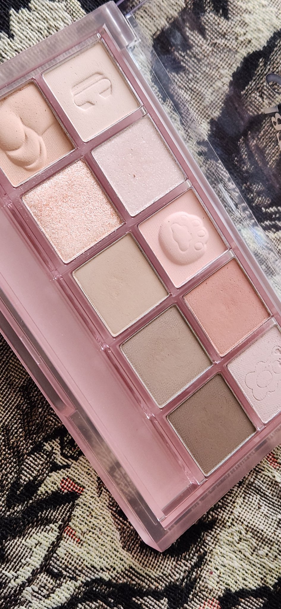 粉は全部ラメ?パール?が入っていて、発色いいのに透明感と立体感と輝きが塗るだけで出ます!明らかにプチプラや韓国コスメにはないデパコスらしい質感。 このカラーは仕上げラメらしきものはなくて、全部が似たような質感です。色分けは陰影を作るのに、ベースの薄ピンク、濃いピンク、茶色とイエベ春っぽいけど黄色に寄ってる感じはしないような絶妙な可愛いピンクメイクのためになってます。 真ん中のはアイシャドウベースとして使うもので、スフレのような気持ちいいさわり心地です。これの上にカラーを重ねると少しミルキーになった気がしました。
