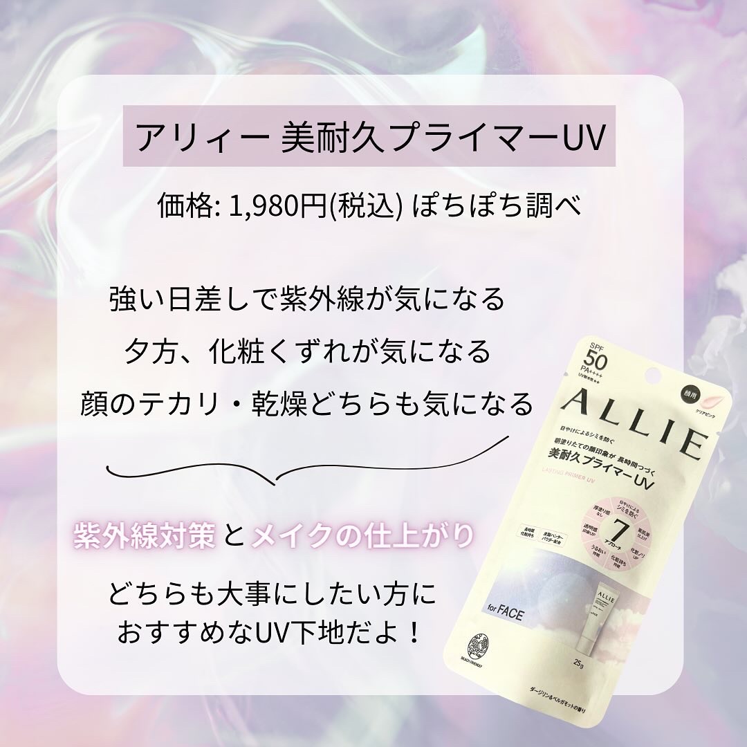 ALLIEのプロモーションに参加中『UV下地だけで、7つの美へアプローチ。朝塗りたての顔印象つづく美耐久プライマー、誕生』今回使ってみたのは、アリィーラスティングプライマーUV@alliepr_jp<日中の7悩みにアプローチ~カプセル化技術に...
