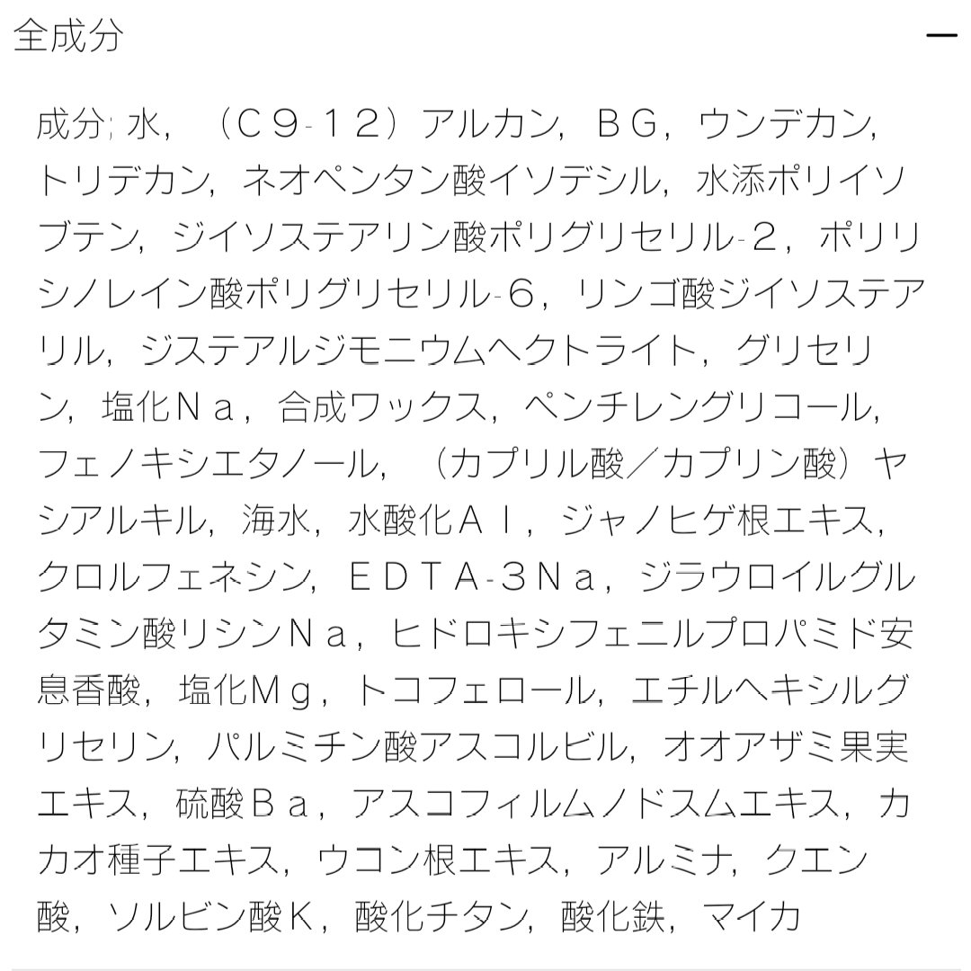 - <02162> 水、(C9-12)アルカン、BG、ウンデカン、トリデカン、ネオペンタン酸イソデシル、水添ポリイソブテン、ジイソステアリン酸ポリグリセリル-2、ポリリシノレイン酸ポリグリセリル-6、リンゴ酸ジイソステアリル、ジステアルジモニウムヘクトライト、グリセリン、塩化Na、合成ワックス、ペンチレングリコール、フェノキシエタノール、(カプリル酸/カプリン酸)ヤシアルキル、海水、水酸化Al、ジャノヒゲ根エキス、クロルフェネシン、EDTA-3Na、ジラウロイルグルタミン酸リシンNa、ヒドロキシフェニルプロパミド安息香酸、塩化Mg、トコフェロール、エチルヘキシルグリセリン、パルミチン酸アスコルビル、オオアザミ果実エキス、硫酸Ba、アスコフィルムノドスムエキス、カカオ種子エキス、ウコン根エキス、アルミナ、クエン酸、ソルビン酸K、酸化チタン、酸化鉄、マイカ <02164> 水、(C9-12)アルカン、BG、ウンデカン、トリデカン、ネオペンタン酸イソデシル、水添ポリイソブテン、ジイソステアリン酸ポリグリセリル-2、ポリリシノレイン酸ポリグリセリル-6、リンゴ酸ジイソステアリル、ジステアルジモニウムヘクトライト、グリセリン、塩化Na、合成ワックス、ペンチレングリコール、フェノキシエタノール、(カプリル酸/カプリン酸)ヤシアルキル、海水、水酸化Al、ジャノヒゲ根エキス、クロルフェネシン、EDTA-3Na、ジラウロイルグルタミン酸リシンNa、ヒドロキシフェニルプロパミド安息香酸、塩化Mg、トコフェロール、エチルヘキシルグリセリン、パルミチン酸アスコルビル、オオアザミ果実エキス、硫酸Ba、アスコフィルムノドスムエキス、カカオ種子エキス、ウコン根エキス、アルミナ、クエン酸、ソルビン酸K、酸化チタン、酸化鉄、マイカ <02166> 水、(C9-12)アルカン、BG、ウンデカン、トリデカン、ネオペンタン酸イソデシル、水添ポリイソブテン、ジイソステアリン酸ポリグリセリル-2、ポリリシノレイン酸ポリグリセリル-6、リンゴ酸ジイソステアリル、ジステアルジモニウムヘクトライト、グリセリン、塩化Na、合成ワックス、ペンチレングリコール、フェノキシエタノール、(カプリル酸/カプリン酸)ヤシアルキル、海水、水酸化Al、ジャノヒゲ根エキス、クロルフェネシン、EDTA-3Na、ジラウロイルグルタミン酸リシンNa、ヒドロキシフェニルプロパミド安息香酸、塩化Mg、トコフェロール、エチルヘキシルグリセリン、パルミチン酸アスコルビル、オオアザミ果実エキス、硫酸Ba、アスコフィルムノドスムエキス、カカオ種子エキス、ウコン根エキス、アルミナ、クエン酸、ソルビン酸K、酸化チタン、酸化鉄、マイカ <02168> 水、(C9-12)アルカン、BG、ウンデカン、トリデカン、ネオペンタン酸イソデシル、水添ポリイソブテン、ジイソステアリン酸ポリグリセリル-2、ポリリシノレイン酸ポリグリセリル-6、リンゴ酸ジイソステアリル、ジステアルジモニウムヘクトライト、グリセリン、塩化Na、合成ワックス、ペンチレングリコール、フェノキシエタノール、(カプリル酸/カプリン酸)ヤシアルキル、海水、水酸化Al、ジャノヒゲ根エキス、クロルフェネシン、EDTA-3Na、ジラウロイルグルタミン酸リシンNa、ヒドロキシフェニルプロパミド安息香酸、塩化Mg、トコフェロール、エチルヘキシルグリセリン、パルミチン酸アスコルビル、オオアザミ果実エキス、硫酸Ba、アスコフィルムノドスムエキス、カカオ種子エキス、ウコン根エキス、アルミナ、クエン酸、ソルビン酸K、酸化チタン、酸化鉄、マイカ <02170> 水、(C9-12)アルカン、BG、ウンデカン、トリデカン、ネオペンタン酸イソデシル、水添ポリイソブテン、ジイソステアリン酸ポリグリセリル-2、ポリリシノレイン酸ポリグリセリル-6、リンゴ酸ジイソステアリル、ジステアルジモニウムヘクトライト、グリセリン、塩化Na、合成ワックス、ペンチレングリコール、フェノキシエタノール、(カプリル酸/カプリン酸)ヤシアルキル、海水、水酸化Al、ジャノヒゲ根エキス、クロルフェネシン、EDTA-3Na、ジラウロイルグルタミン酸リシンNa、ヒドロキシフェニルプロパミド安息香酸、塩化Mg、トコフェロール、エチルヘキシルグリセリン、パルミチン酸アスコルビル、オオアザミ果実エキス、硫酸Ba、アスコフィルムノドスムエキス、カカオ種子エキス、ウコン根エキス、アルミナ、クエン酸、ソルビン酸K、酸化チタン、酸化鉄、マイカ <02172> 水、(C9-12)アルカン、BG、ウンデカン、トリデカン、ネオペンタン酸イソデシル、水添ポリイソブテン、ジイソステアリン酸ポリグリセリル-2、ポリリシノレイン酸ポリグリセリル-6、リンゴ酸ジイソステアリル、ジステアルジモニウムヘクトライト、グリセリン、塩化Na、合成ワックス、ペンチレングリコール、フェノキシエタノール、(カプリル酸/カプリン酸)ヤシアルキル、海水、水酸化Al、ジャノヒゲ根エキス、クロルフェネシン、EDTA-3Na、ジラウロイルグルタミン酸リシンNa、ヒドロキシフェニルプロパミド安息香酸、塩化Mg、トコフェロ