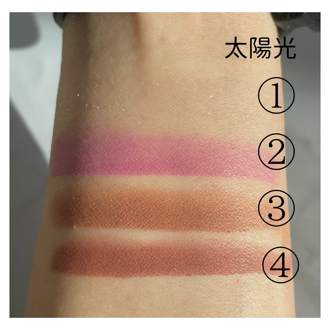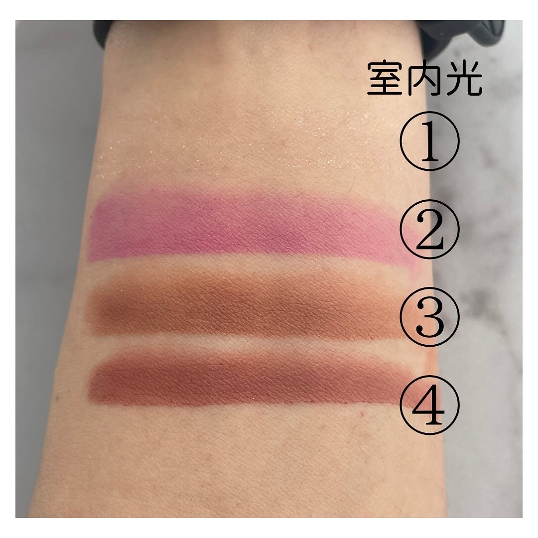 ツヤと血色感、両方手に入る欲張りチーク✨ 粘度が低い液体で、サッと滑らせるだけでも綺麗につきます(スウォッチは指で3回伸ばした) 指で伸ばしてから境目をぽんぽんするだけでも良いですが、スポンジで丁寧に馴染ませるとより自然な仕上がりに✨ スウォッチはピーチピンク&ゴールデンシマーのゴールドパールが目立ちますが、少量頬につけて馴染ませると意外とキラキラした感じがなくて艶に見えます👀 ブルベなので、ソフトライラック1本だけでも良かったんですが、青みが少ないアイメイクをする時はモーヴピンクを使うことも ピーチピンク&ゴールデンシマーはゴールドパールが入っているのでマットのアイシャドウとの相性はちょっと微妙、下2色はどんな質感のアイシャドウとも相性が良いかと思います このリキッドチークは色展開も豊富で購入する時迷いましたが(3/12現在で9色)、モーヴピンクかソフトライラックが失敗が少ないかもしれません