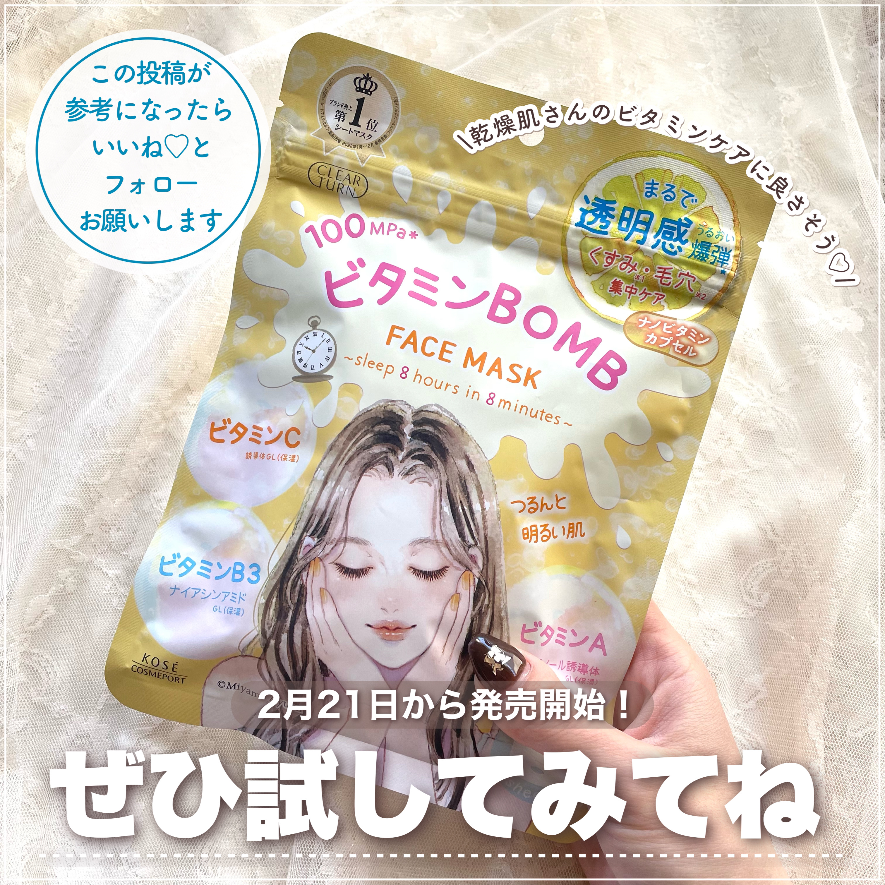 #第一印象アップ術\クリアターンビタミンBOMBマスク/LDKのA評価にも輝いた大人気シートマスクのビタミンBOMBマスク👑毛穴やくすみ、透明感、ハリのなさにお悩みの方におすすめのシートマスクで、ビタミンCやナイアシンアミド、レチノールなど話...