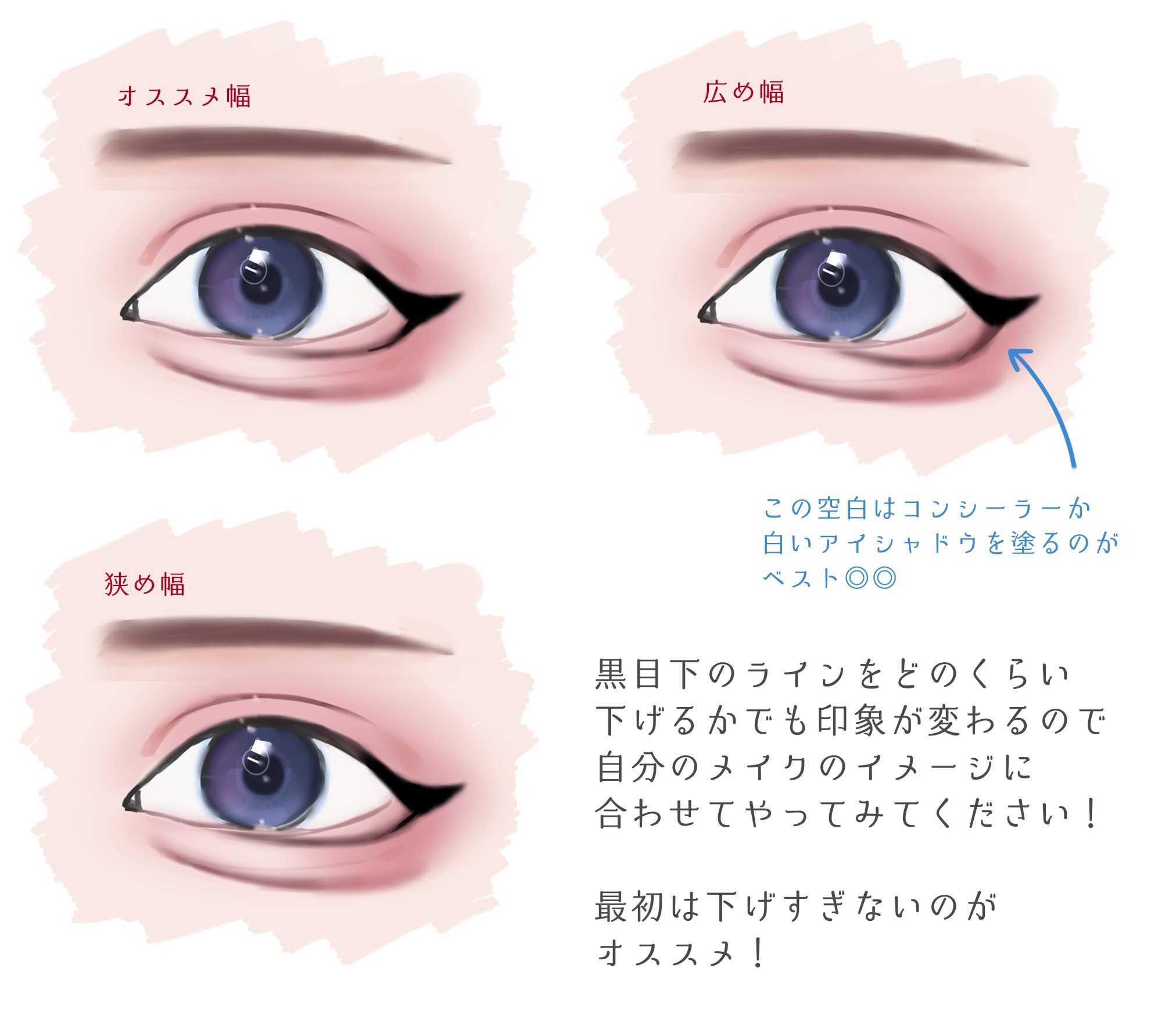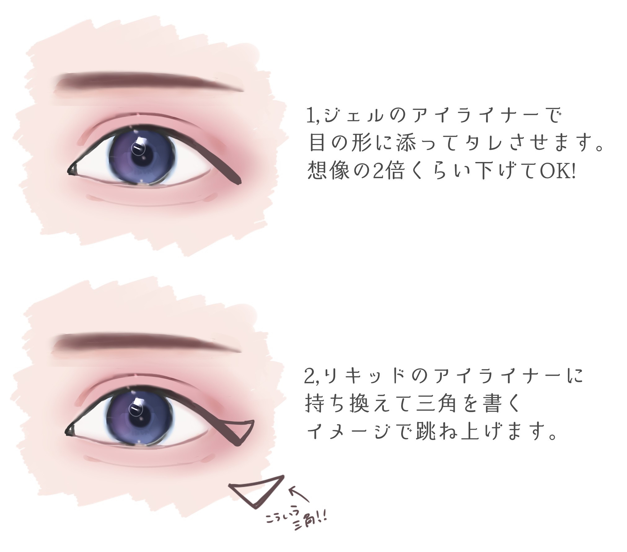日常で一番使いやすいラインです!どんなメイクにも合います✨ 猫目のような跳ね上げたラインです!韓国アイドルっぽいメイクや猫目メイクに合います🐈 子犬のように垂れたラインです!アニメや地雷のような濃いメイクや童顔メイクに合います🐶