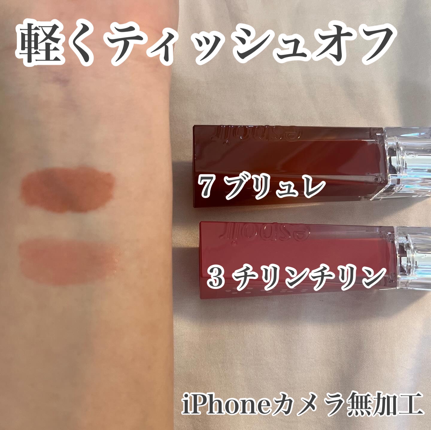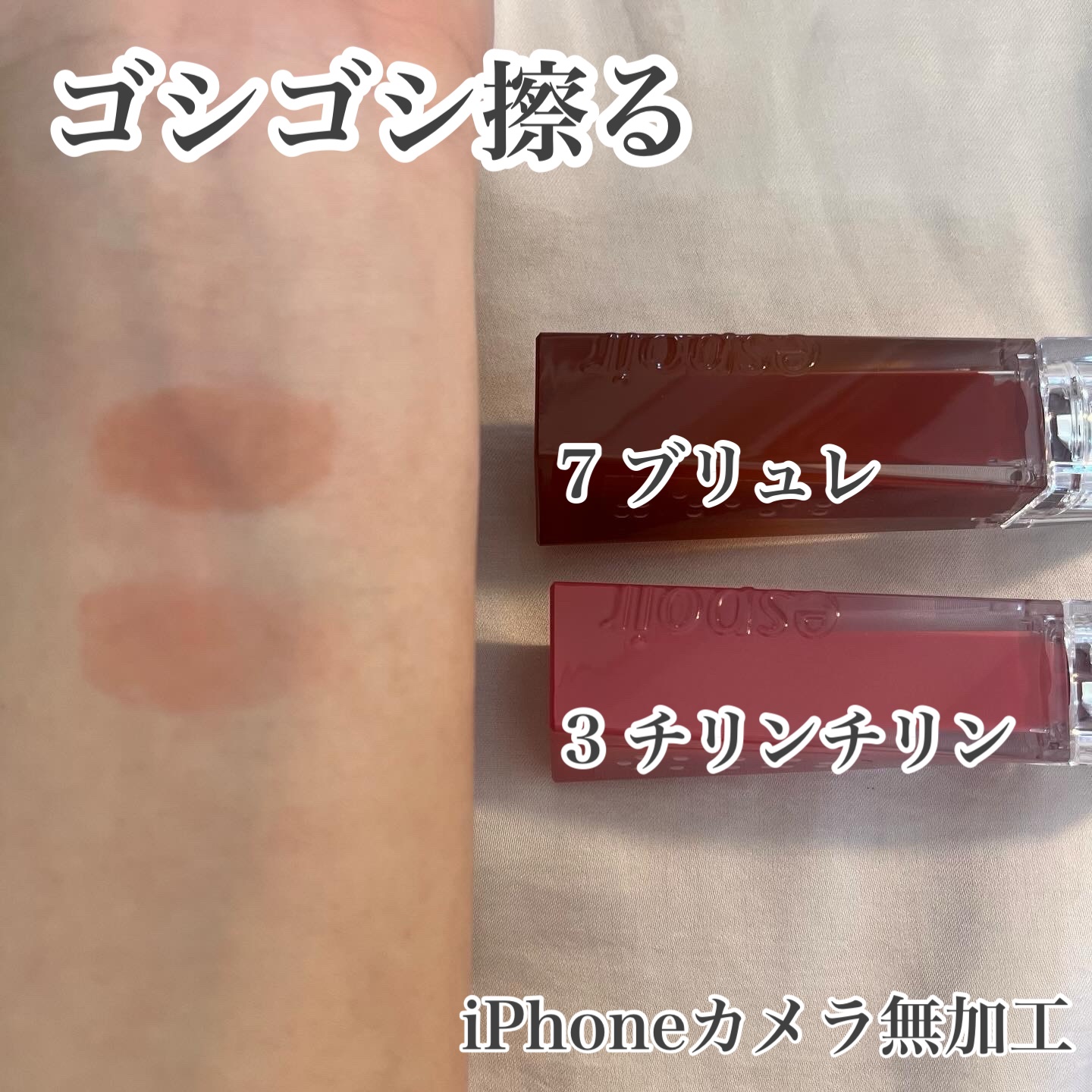 - <アップルシャーベット> 水、リンゴ酸ジイソステアリル、ビスジグリセリルポリアシルアジペート-2、ダイマージリノール酸ダイマージリノレイルビス(ベヘニル/イソステアリル/フィトステリル)、水添ポリイソブテン、ジグリセリン、ジフェニルジメチコン、セチルPEG/PPG-10/1ジメチコン、トリメチルシロキシフェニルジメチコン、ポリソルベート60、ペンチレングリコール、イソステアリン酸ソルビタン、イソステアリン酸ポリグリセリル-4、フェノキシエタノール、(アクリル酸ヒドロキシエチル/アクリロイルジメチルタウリンNa)コポリマー、セテアレス-20、スクワラン、香料、ジラウラミドグルタミドリシンNa、エチルヘキシルグリセリン、エチレンジアミンジコハク酸3Na、黄5、赤227、赤104(1)、黄4 <オッドコーラル> 水、リンゴ酸ジイソステアリル、ダイマージリノール酸ダイマージリノレイルビス(ベヘニル/イソステアリル/フィトステリル)、ビスジグリセリルポリアシルアジペート-2、水添ポリイソブテン、ジフェニルジメチコン、ジグリセリン、セチルPEG/PPG-10/1ジメチコン、トリメチルシロキシフェニルジメチコン、ポリソルベート60、ペンチレングリコール、イソステアリン酸ソルビタン、イソステアリン酸ポリグリセリル-4、フェノキシエタノール、セテアレス-20、(アクリル酸ヒドロキシエチル/アクリロイルジメチルタウリンNa)コポリマー、スクワラン、香料、ジラウラミドグルタミドリシンNa、エチルヘキシルグリセリン、エチレンジアミンジコハク酸3Na、水酸化Al、ポリアクリル酸アンモニウム、BG、酸化チタン、黄5、赤104(1)、黄4、赤227、青1 <チリンチリン> 水、リンゴ酸ジイソステアリル、ダイマージリノール酸ダイマージリノレイルビス(ベヘニル/イソステアリル/フィトステリル)、ビスジグリセリルポリアシルアジペート-2、水添ポリイソブテン、ジグリセリン、ジフェニルジメチコン、セチルPEG/PPG-10/1ジメチコン、トリメチルシロキシフェニルジメチコン、ポリソルベート60、ペンチレングリコール、イソステアリン酸ソルビタン、イソステアリン酸ポリグリセリル-4、フェノキシエタノール、セテアレス-20、(アクリル酸ヒドロキシエチル/アクリロイルジメチルタウリンNa)コポリマー、スクワラン、香料、ジラウラミドグルタミドリシンNa、エチルヘキシルグリセリン、エチレンジアミンジコハク酸3Na、水酸化Al、ポリアクリル酸アンモニウム、BG、酸化チタン、黄5、赤227、黄4、赤104(1)、青1 <ハッシュドチェリー> 水、リンゴ酸ジイソステアリル、ビスジグリセリルポリアシルアジペート-2、ダイマージリノール酸ダイマージリノレイルビス(ベヘニル/イソステアリル/フィトステリル)、水添ポリイソブテン、ジグリセリン、ジフェニルジメチコン、トリメチルシロキシフェニルジメチコン、セチルPEG/PPG-10/1ジメチコン、ポリソルベート60、ペンチレングリコール、イソステアリン酸ソルビタン、イソステアリン酸ポリグリセリル-4、フェノキシエタノール、セテアレス-20、(アクリル酸ヒドロキシエチル/アクリロイルジメチルタウリンNa)コポリマー、スクワラン、香料、ジラウラミドグルタミドリシンNa、エチルヘキシルグリセリン、エチレンジアミンジコハク酸3Na、赤227、黄5、黄4、赤104(1)、青1 <ローザ> 水、リンゴ酸ジイソステアリル、ダイマージリノール酸ダイマージリノレイルビス(ベヘニル/イソステアリル/フィトステリル)、ビスジグリセリルポリアシルアジペート-2、水添ポリイソブテン、ジグリセリン、ジフェニルジメチコン、トリメチルシロキシフェニルジメチコン、セチルPEG/PPG-10/1ジメチコン、ポリソルベート60、ペンチレングリコール、イソステアリン酸ソルビタン、イソステアリン酸ポリグリセリル-4、フェノキシエタノール、セテアレス-20、(アクリル酸ヒドロキシエチル/アクリロイルジメチルタウリンNa)コポリマー、スクワラン、香料、ジラウラミドグルタミドリシンNa、エチルヘキシルグリセリン、エチレンジアミンジコハク酸3Na、酸化チタン、赤227、赤104(1)、黄4、黄5、水酸化Al、ポリアクリル酸アンモニウム、BG、青1 <ピンキーローキー> 水、リンゴ酸ジイソステアリル、ダイマージリノール酸ダイマージリノレイルビス(ベヘニル/イソステアリル/フィトステリル)、ビスジグリセリルポリアシルアジペート-2、水添ポリイソブテン、ジグリセリン、ジフェニルジメチコン、トリメチルシロキシフェニルジメチコン、セチルPEG/PPG-10/1ジメチコン、ポリソルベート60、ペンチレングリコール、イソステアリン酸ソルビタン、イソステアリン酸ポリグリセリル-4、フェノキシエタノール、セテアレス-20、(アクリル酸ヒドロキシエチル/アクリロイルジメチルタウリンNa)コポリマー、スクワラン、香料、ジラウラミドグルタミドリシンNa、エチルヘキシルグリセリン、エチレンジアミンジコハク酸3Na、酸化チタン、黄5、赤227、黄4、赤104(1)、青1、水酸化Al、ポリアクリル <アンダーモーブ> 水、リンゴ酸ジイソステア