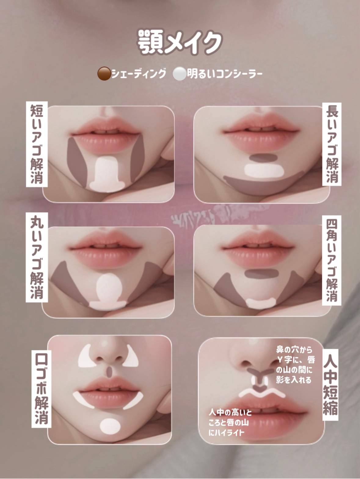 印象が激変する! 下顔面が可愛くなるメイクテク8選です🙌🏻 あごが長い面長解消 あごが3.5cm以上あって面長が気になっている人におすすめ! エラ解消 エラが気になる人におすすめ!暗めのシェーディングを使うのがポイント