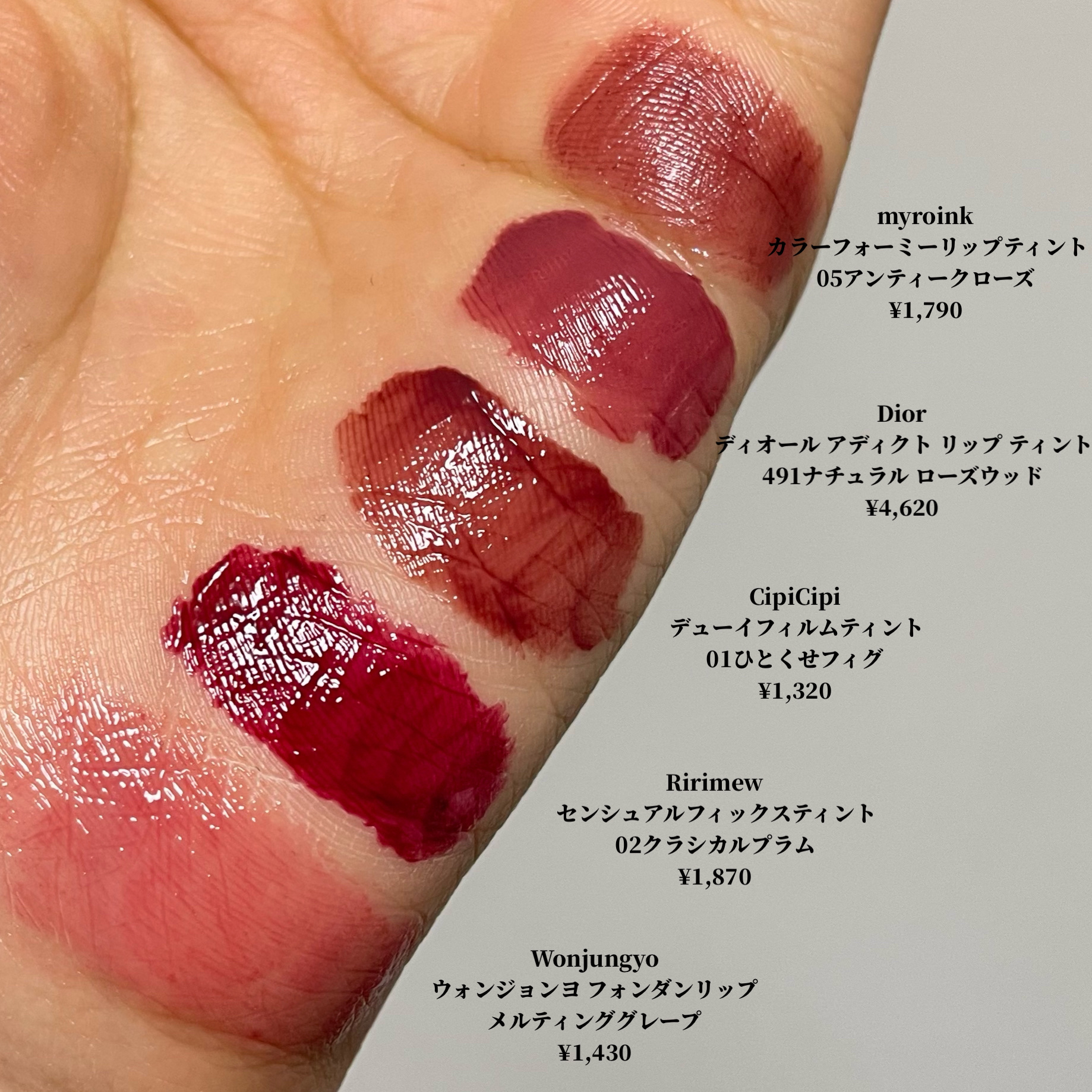大人気ティントから秋っぽくすみカラーが追加! 3色とも美味しそうな名前がついていてまさに食欲の秋って感じのカラーです😋🍠 やや黄み寄りの落ち着いた深め赤みブラウン 2ndブルベ冬のイエベ秋のナチュラルリップにおすすめ! 色持ちやツヤの持ちはかなりよかった!! 香りがかな〜〜り強烈で長持ちするから強い香料が苦手な人もちょい注意かも🙏🏻