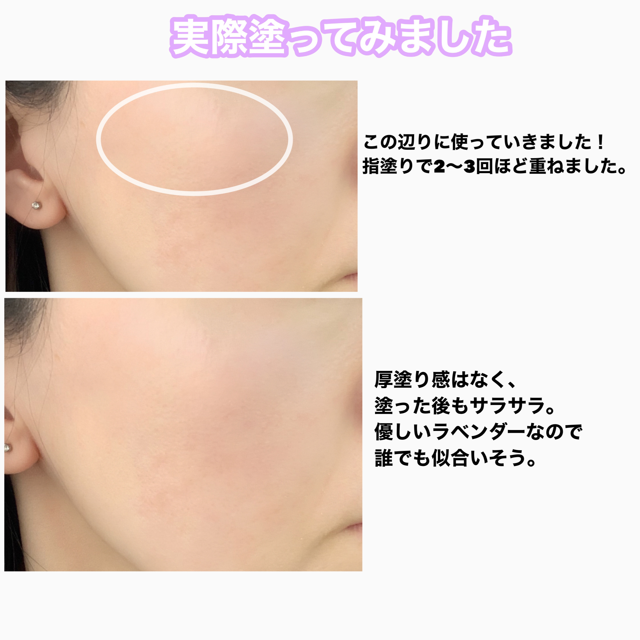 透明感のある仕上がりに🪄 白っぽいラベンダーカラーが可愛い🦄 肌の上に乗せると白みピンクカラーになるので程よい血色感があります👼🏻 しっとりした粉質で粉っぽさを感じません💎 パケが可愛くて他のカラーも集めたいです🌼