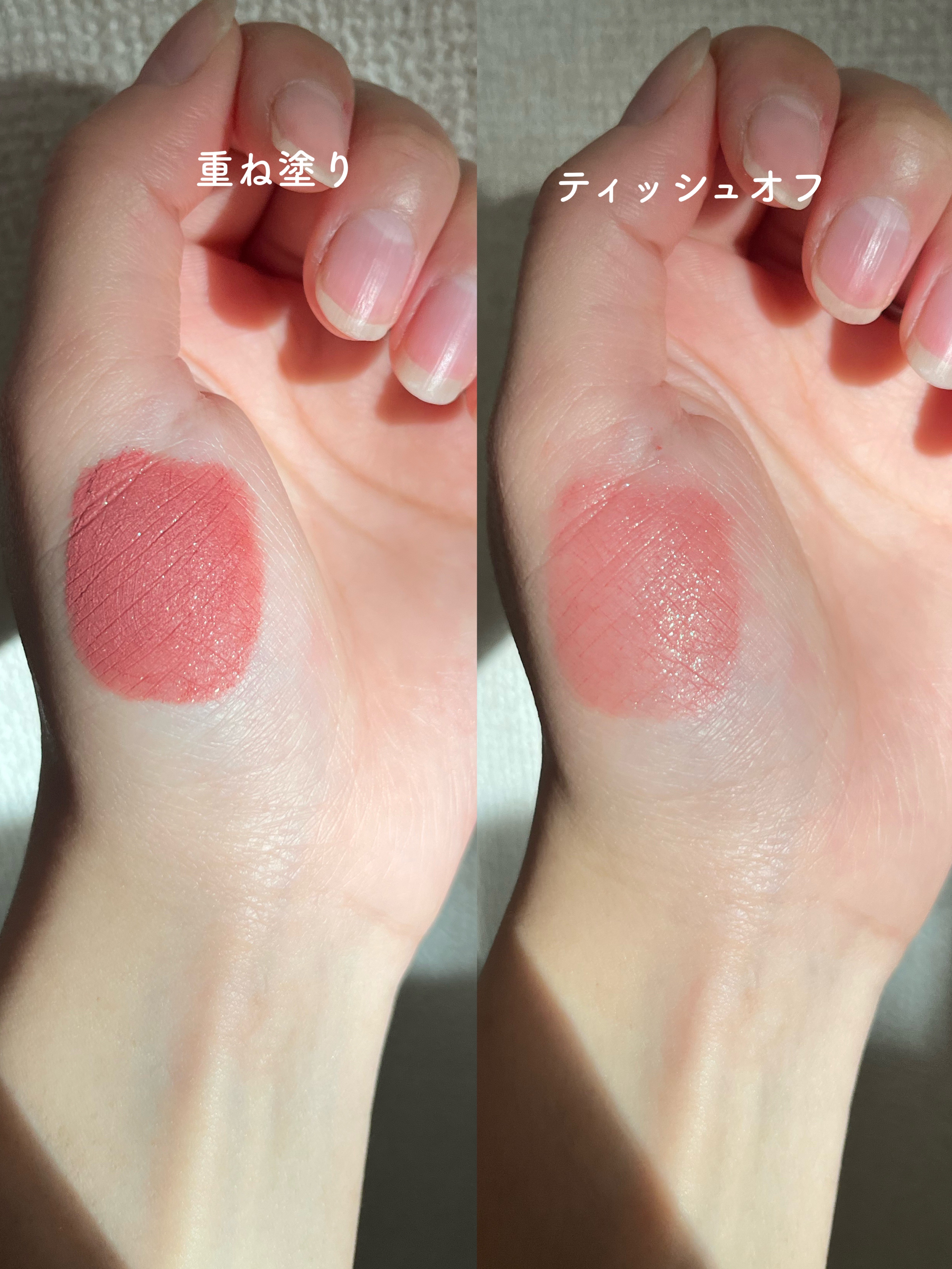 rom&ndの大人気ティントをご紹介します! みずみずしいウォーターベースのティントで色持ちも抜群。 03は赤みの強いオレンジカラーです!イエベ春と相性抜群。 06はパッとした青み系のピンクです!ブルベ夏さんと相性が良さそう。 私は特に唇が荒れやすいので少し経つと乾燥はしました。 ですが今まで使った中では1番保湿力を感じて、ティントの中ではうるおい力が高い方かと思います! ツヤ感が好きな方やマスクメイクでティント愛用の方などにオススメです!春メイクにもぴったりなので気になった方はぜひチェックしてみて下さい🪄