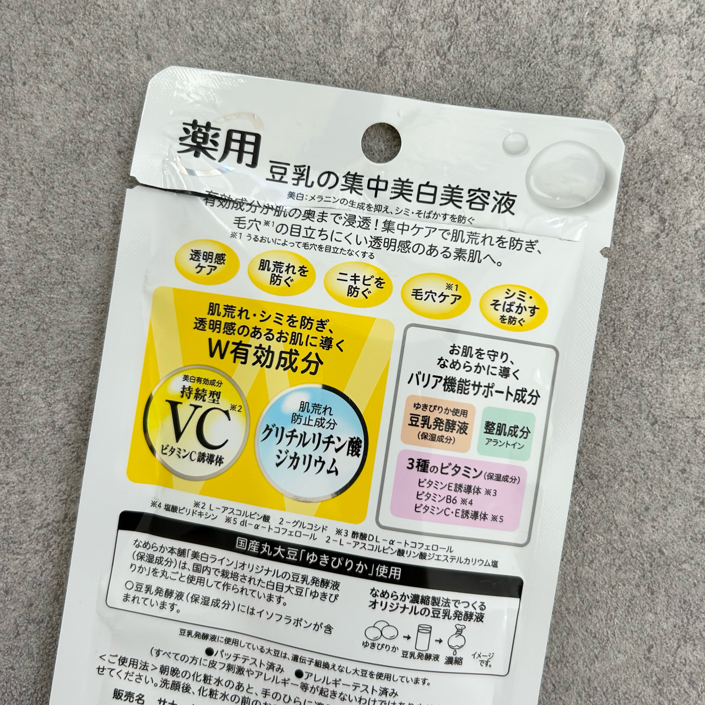 - <なめらか本舗 薬用純白美容液> L-アスコルビン酸 2-グルコシド、グリチルリチン酸ジカリウム、水、1,3-プロパンジオール、濃グリセリン、DPG、BG、グリコシルトレハロース・水添デンプン分解物混合溶液、ポリオキシエチレンメチルグルコシド、エタノール、豆乳発酵液、dl-α-トコフェロール 2-L-アスコルビン酸リン酸ジエステルカリウム塩、酢酸DL-α-トコフェロール、塩酸ピリドキシン、アラントイン、水酸化大豆リン脂質、アルギン酸ナトリウム、カラギーナン、クエン酸、クエン酸Na、ダイズエキス、ヒドロキシエチルセルロース、ポリオキシエチレン硬化ヒマシ油、水酸化Na、フェノキシエタノール