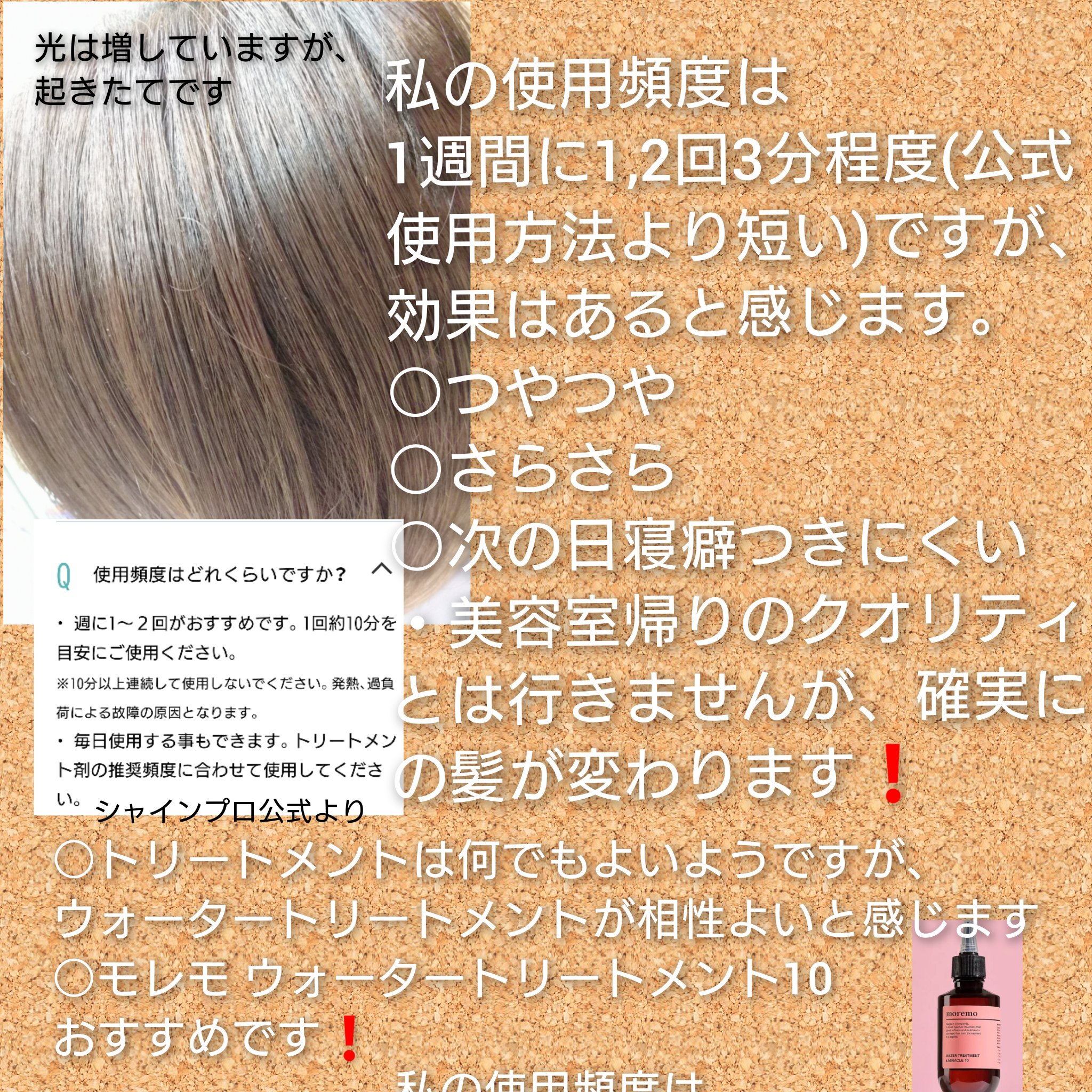 アウトバスでもインバスでも使える。超音波によるトリートメントの浸透率上がるらしい(うろ覚え)。 良すぎてビビってます。え?嘘じゃんってレベルで髪サラサラなる。旦那から『めちゃくちゃ綺麗じゃん。一回でこんなに変わるもんなん?』と褒められました。 この時間でこんな綺麗な髪になるならコスパもタイパも良すぎ。リップスのクーポンとかポイント使って2万くらいで買えたのも嬉しい。