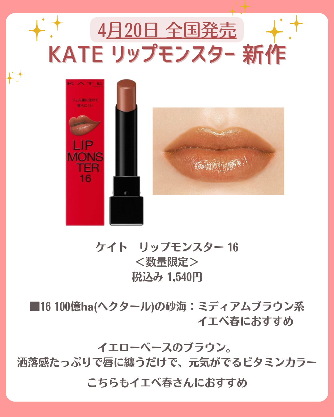 4月20日に発売の『KATEのリップモンスター』の夏の新作は、イエベ&ブルべ用のブラウンカラーリップ✨ さらに数量限定で、手持ちのリップをイエベ用、ブルべ用にカラーニュアンスを変化させる凄すぎる新作『色化けモンスターリップ』も登場💡 ■ケイト リップモンスター 新3色 各1,540円 ■ケイト リップモンスターカラートナー 限定2色 各1,650円<数量限定>