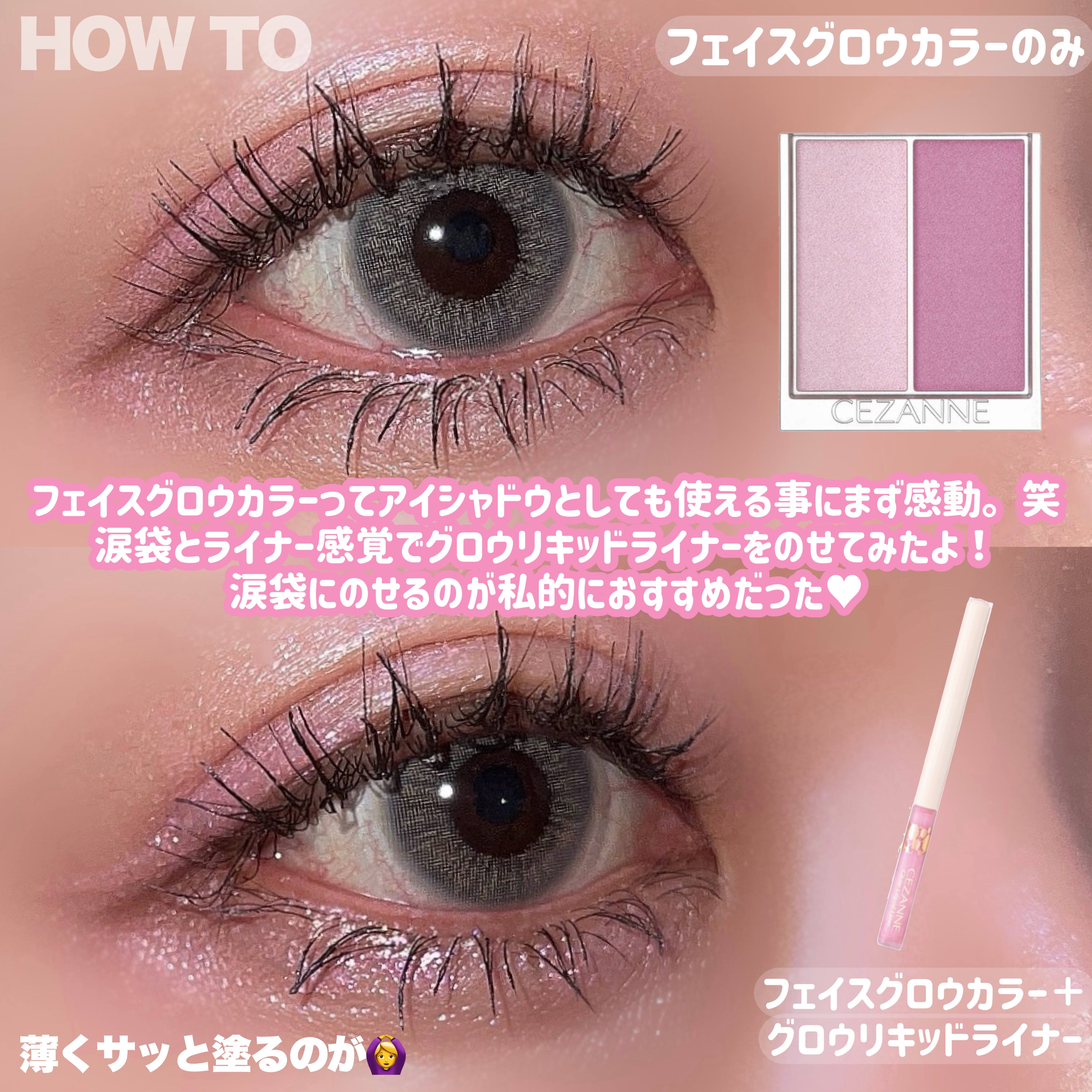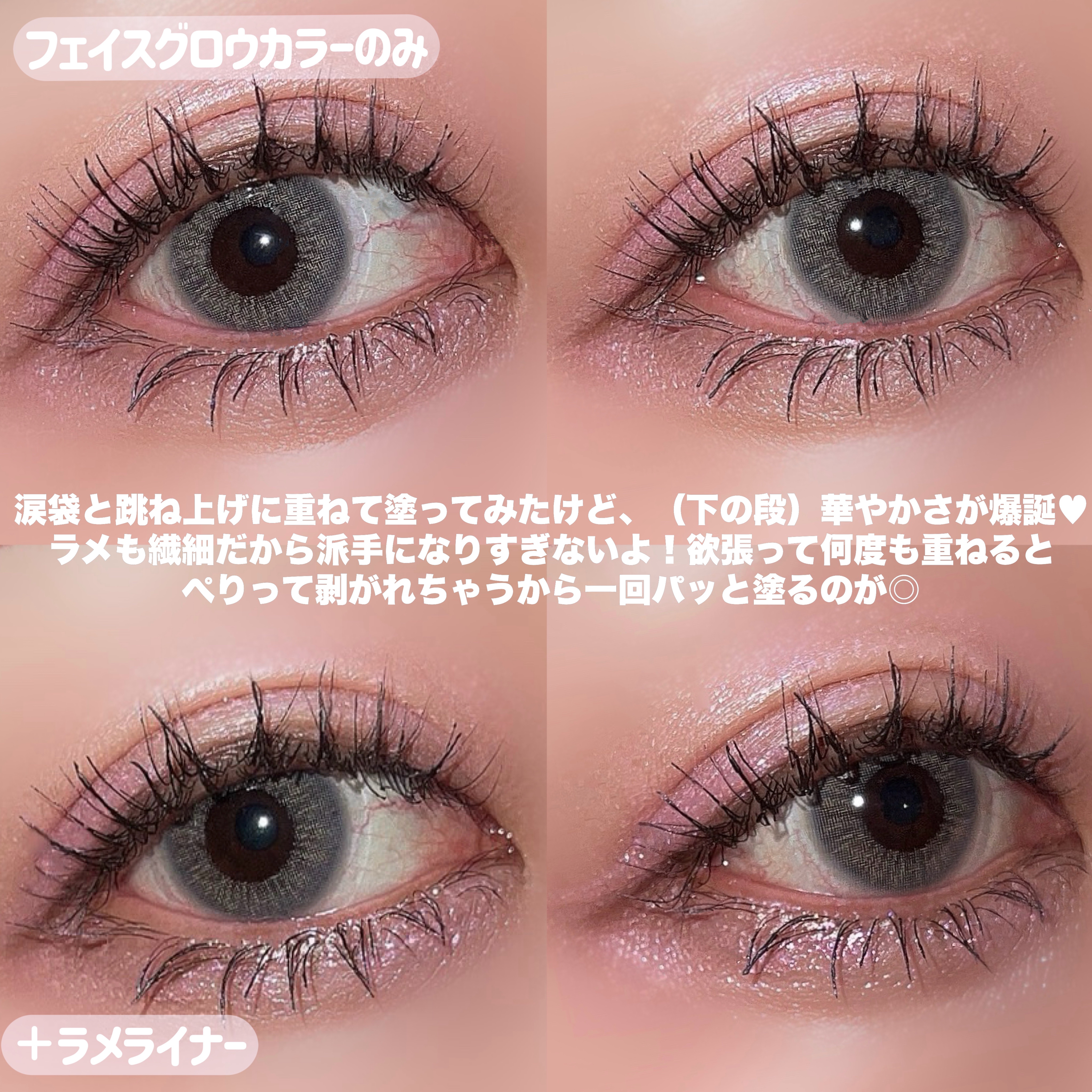 涙袋のちょい上?1番光が入る部分にラメライナー引くのにハマっててコスパ良過ぎて結局3色全部購入。 他社のラメライナーに比べて繊細で自然な大きさのラメ🫧 多色ラメで使いやすいクリスタルカラー。 どんなメイクにも合わせやすく、塗るだけで一気に目元が華やかになります💜 ダントツ1番使用頻度高いハートフィズ🩷 ピンクベージュ系、ピンク系のメイクと相性抜群。これ引くだけで一気に可愛らしいうるっと涙袋爆誕🥺
