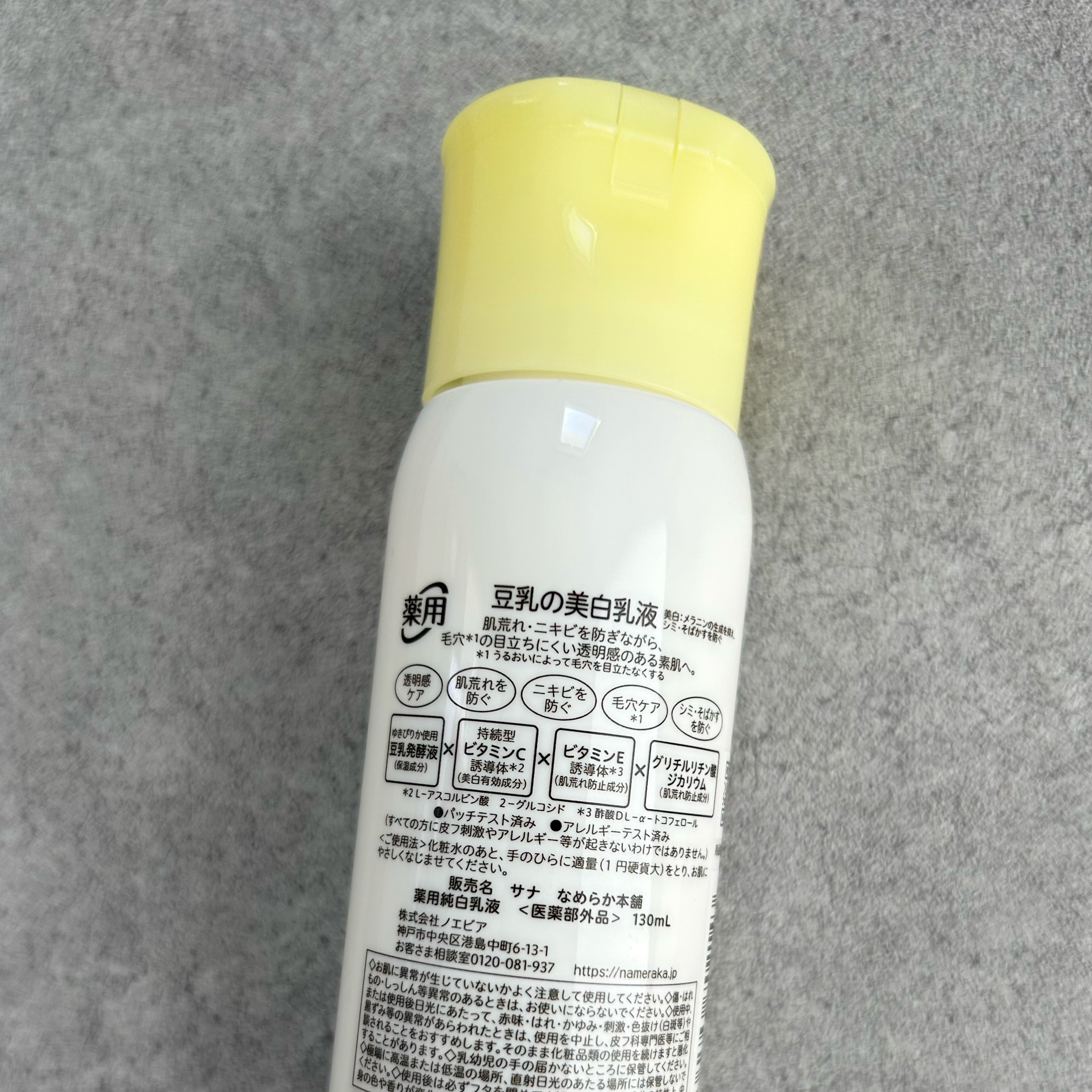 - <なめらか本舗 薬用純白乳液> L-アスコルビン酸 2-グルコシド、酢酸DL-α-トコフェロール、グリチルリチン酸ジカリウム、水、BG、濃グリセリン、テトラ2-エチルヘキサン酸ペンタエリトリット、ジステアリン酸ポリグリセリル、ポリオキシエチレンメチルグルコシド、2-エチルヘキサン酸セチル、豆乳発酵液、エタノール、カルボキシビニルポリマー、キサンタンガム、クエン酸Na、ジエチレントリアミン五酢酸五ナトリウム液、ダイズエキス、ベヘニルアルコール、親油型モノステアリン酸グリセリル、水酸化Na、水素添加大豆リン脂質、フェノキシエタノール