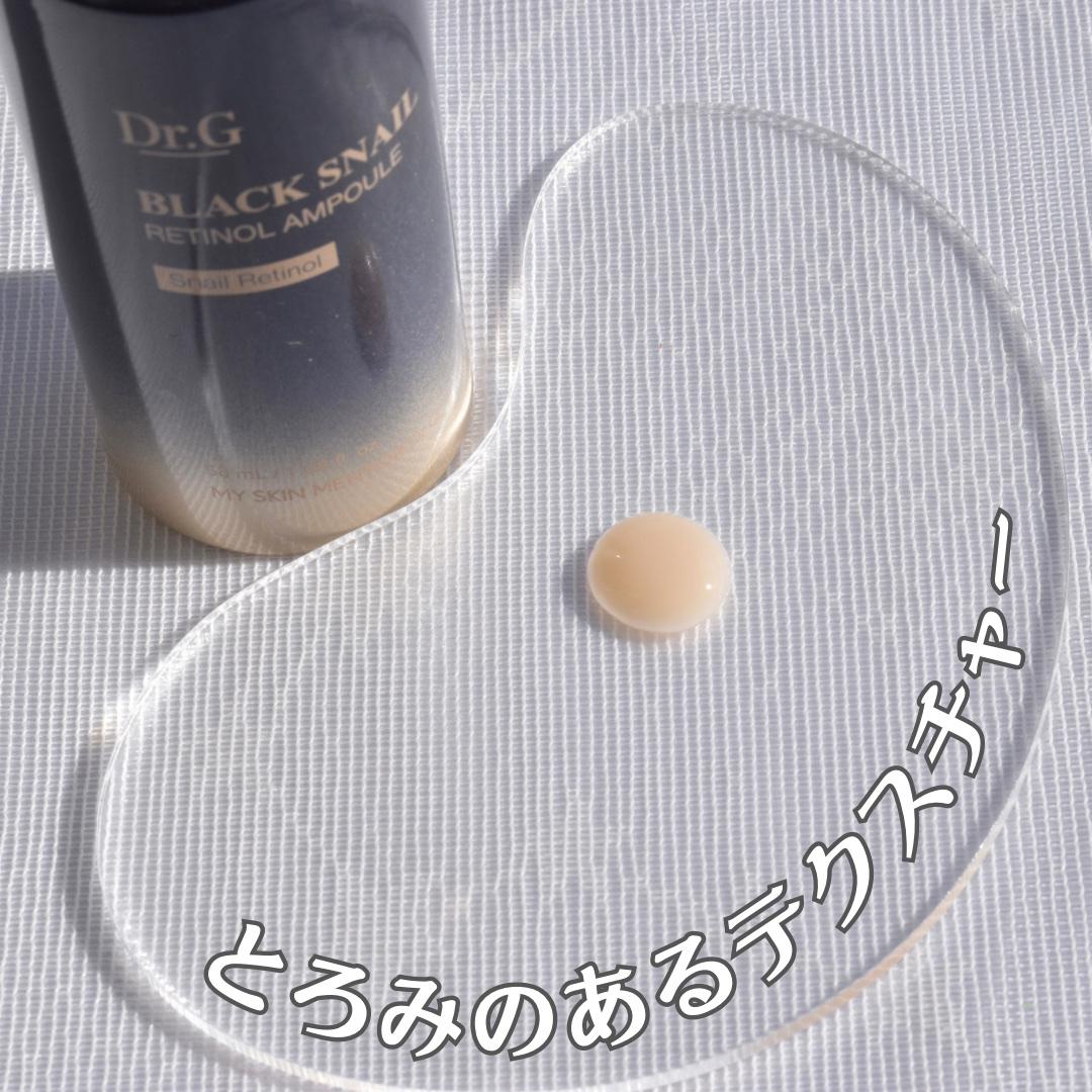 ブラックスネイルと低刺激のレチノールを配合した美容液 とろみがあってミルキーなテクスチャー なめらかにすべるように伸びて気持ちいい使用感で好き ブラックスネイル20%配合クリーム もっちりとした弾力を感じるテクスチャー なめらかに伸びてべたつかない Dr.Gが開発した独自成分のブラックスネイルレチノールは刺激が少なく効果的◎ アトピーもちの敏感肌、乾燥肌だけどトラブルなく使えてるよ♪