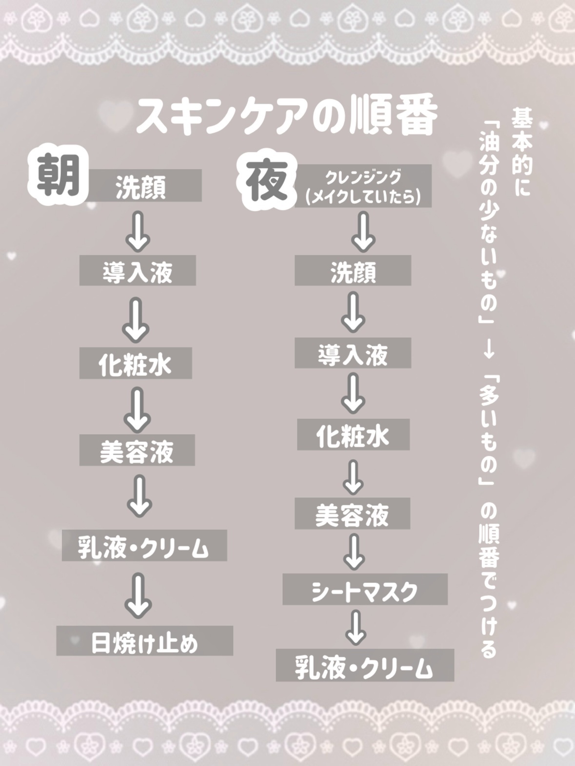 ベースメイクの順番はファンデーションの種類によっても違うのですが、 アイメイクはアイシャドウ→ビューラー→アイライン→マスカラという順番で行います。 アイメイクとのバランスを考えながら、どのリップを塗るかを決めます。 パウダーチークとクリームチークがありますが、クリームチークはムラになりやすいので初心者さんはパウダーがいいかも🙆♀️ ベースメイクの最後でもOKですが、全体のバランスを見ながら入れることでシェーディングが濃くなりすぎたりハイライトを付けすぎるなどの失敗が少なくなります。