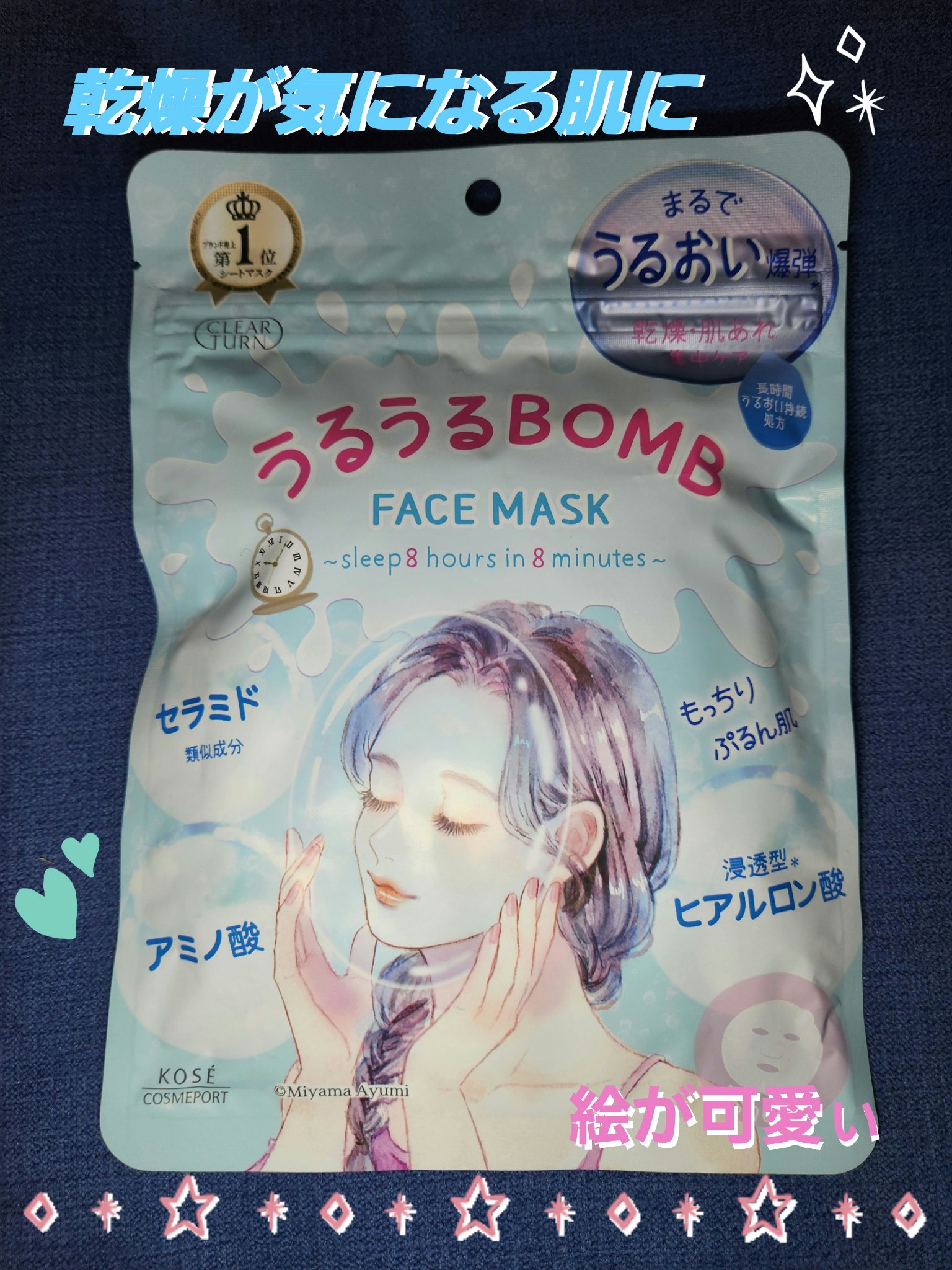 クリアターンうるうるBOMBマスク初めて使うBOMBシリーズ。長時間潤い持続処方が施されていて、美容液は168mlも配合されています!8分の集中ケアで、8時間熟睡したようなお肌にしてくれるらしいので、万年寝不足乾燥肌の私にはとってもありがたい...