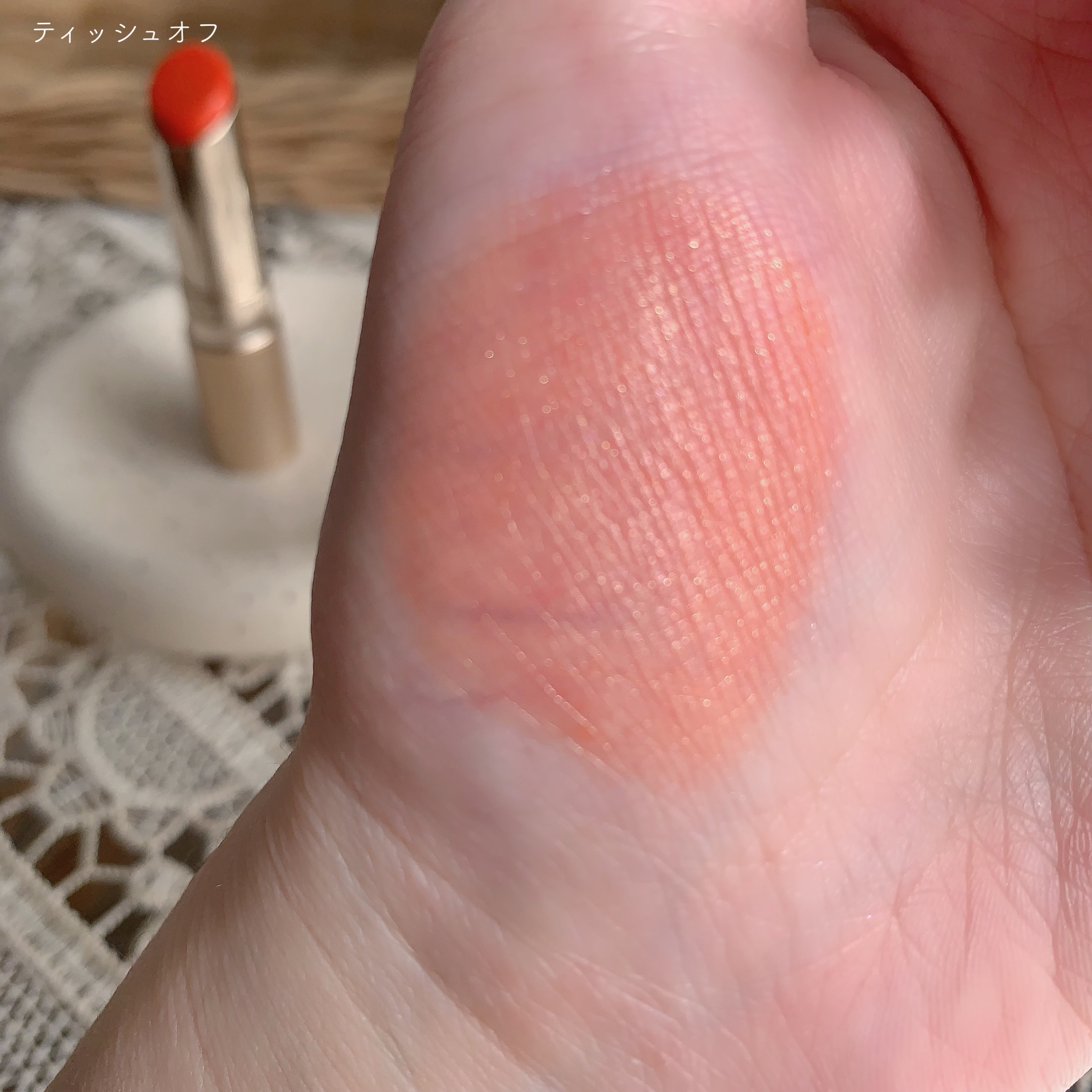 今まで何種類もリップを使ってきましたが、1番お気に入りがこちらです! 色はシアーなオレンジ味を感じるレッドで、落ちにくく、鏡を見なくてもキレイに塗り直せるところが気に入っています! 柔らかくとろける塗りごごちでとても塗りやすいです!