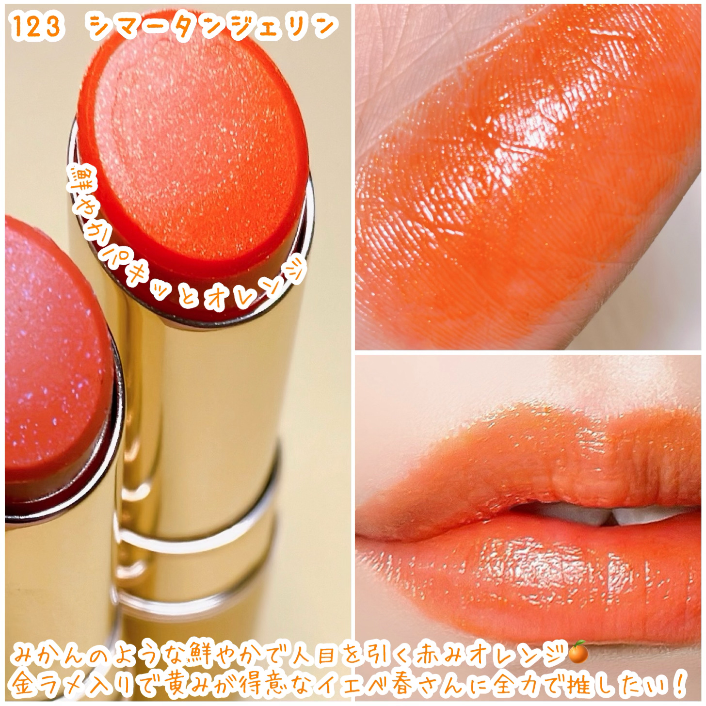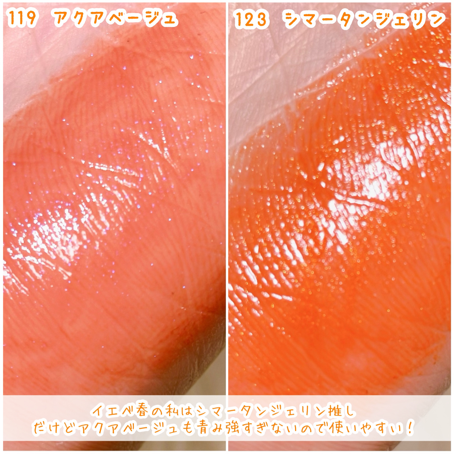 ✿チジャベージュは透け感のあるオレンジ🍊 ✿ポメロスキンはベージュブラウン ✿ヌカダミアはレッドブラウン ✿ヌーディピーナッツはオレンジコーラル🍑 ✿インコーラルはピンクレッド ✿コットンメルバは白味ピンク ✿ソルベバームは元気なオレンジレッド!