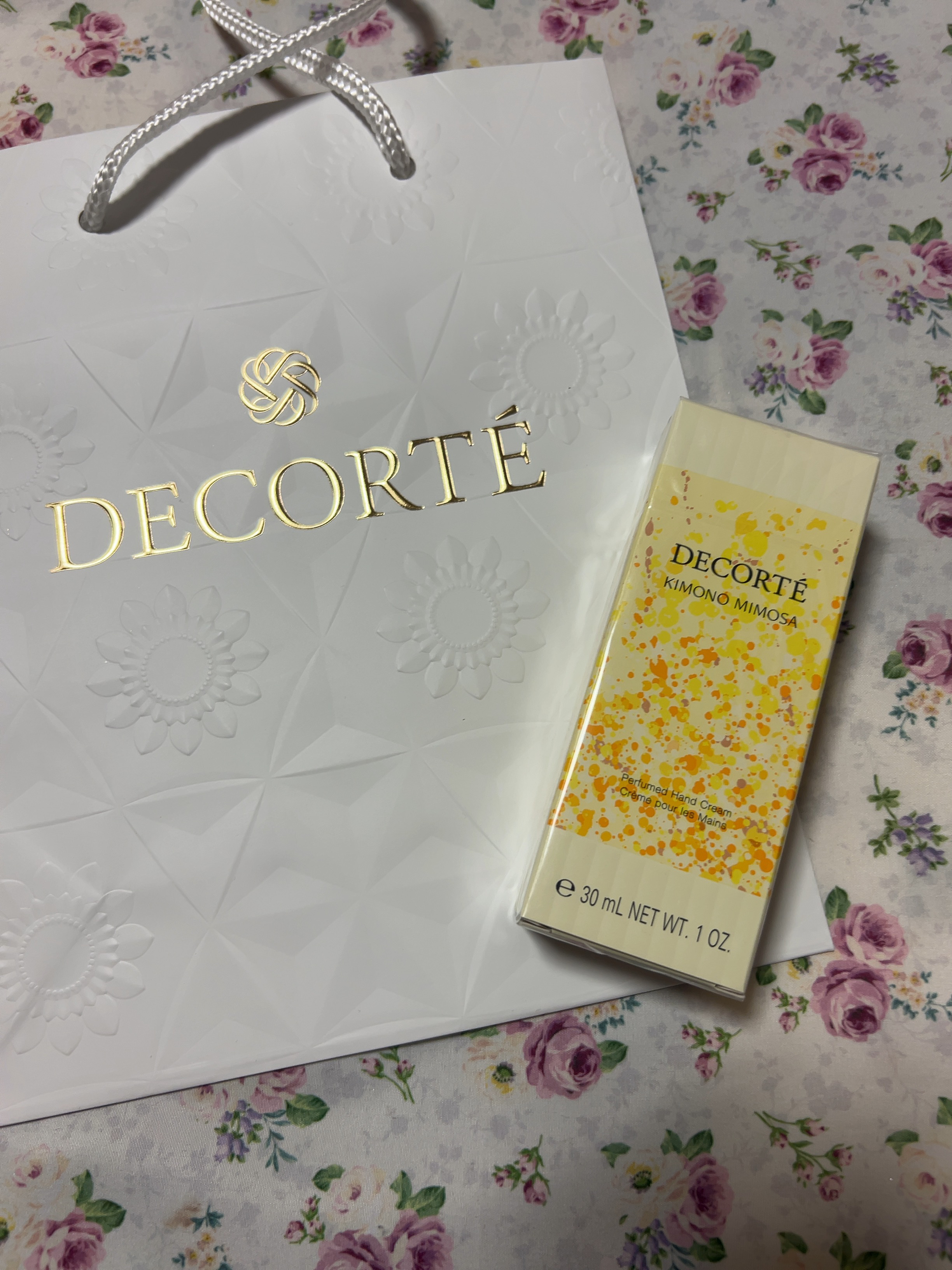 めちゃくちゃ良い香り🍀 DECORTÉ💫 キモノ ミモザ パフュームド ハンドクリーム 30g 輝くミモザの花束を抱きしめたような華やかな甘さのブルーミングフローラルの香りのパフュームド ハンドクリームです。 ベタつかず、すべすべとしたシルクのような肌質感を叶えながら肌あれ・乾燥・大気中の微粒子から手肌を保護します。