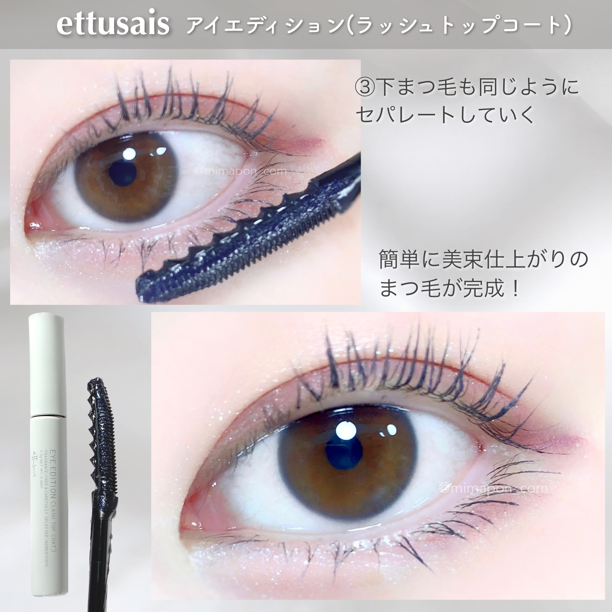 - これ1本でもOK。簡単に束感まつ毛がつくれるマスカラトップコート。 〇美束&セパレートコームで、簡単につるんとしたキレイな束感まつ毛がつくれる。 〇カール持続&パンダ目を防ぐ、トップコート効果。 ーマスカラ下地やマスカラの仕上がりを損なうことなく、長時間カールキープ。 ー汗・涙・皮脂に強く、マスカラ下地やマスカラのにじみを防ぐ。 〇ウォータープルーフ 〇美容液成分配合 ー毛髪トリートメント(アミノ酸)、毛髪保湿成分(ヒアルロン酸)配合 〇無香料 〇アレルギーテスト済み(すべての方にアレルギーが起きないというわけではありません) 2024年2月15日(木)全国発売<2月1日(木)一部先行発売>