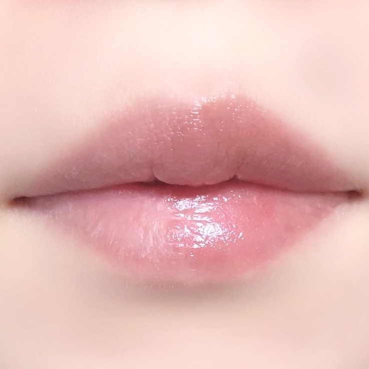 発色は極薄で超超超ナチュラルです。 グリグリ塗っても顔色はドすっぴん→すっぴんに変化したかな?くらいの微々たる血色感なんだけど、保湿力とパールの効果で唇がふっくら綺麗に見えます。 この質感なら男性でも抵抗なく塗れるのでは?ってくらい自然な仕上がりです。 潤いの持続力が高いからその場しのぎのケアで終わらない、頼れるリップクリームという印象。