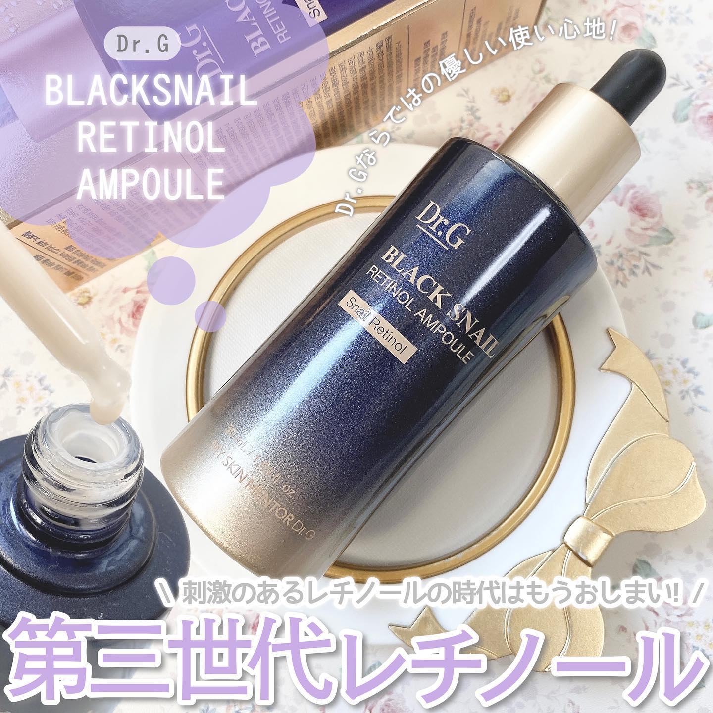 - ブラックスネイル*とレチノール*を配合した、若々しい肌印象に導く美容液です。 Dr.Gのレチノールは独自の成分である、ブラックスネイルレチノール*を使っています! 肌に高い保湿感を与え、肌のキメを整え、弾力やハリのケアを助けるだけでなく、肌の乾燥くすみをケアし、明るい印象のぷるんっとハリのある肌に導きます。 *整肌成分
