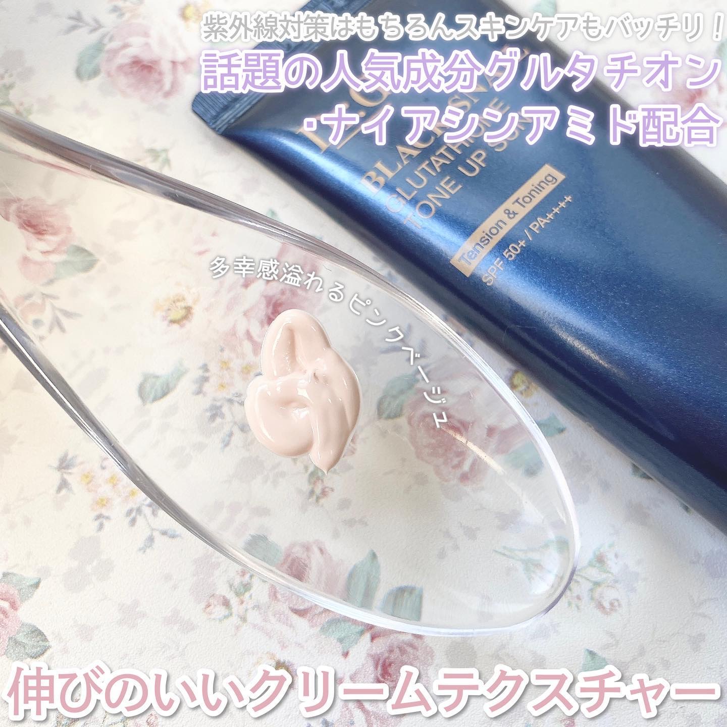 - SPF50+ PA++++ グルタチオン*やナイアシンアミド*が入った、スキンケア効果の高い、化粧下地としても使える日焼け止めです。 さらに、ヒアルロン酸*も入っているので、水分ケアまで可能!冬場でも、長時間乾燥が気になりにくい! スキンケアで肌を潤わしながら、日焼け対策もでき、化粧下地としてベースを整えてくれます。 しっとりとしたテクスチャーですが、仕上がりはベタっとせず、肌の角質層を潤わせるので、メイクの密着力を高め、長時間潤いを感じます。 ほんのりピンクがかった色で、肌に高級感と多幸感を演出してくれます。 *整肌成分