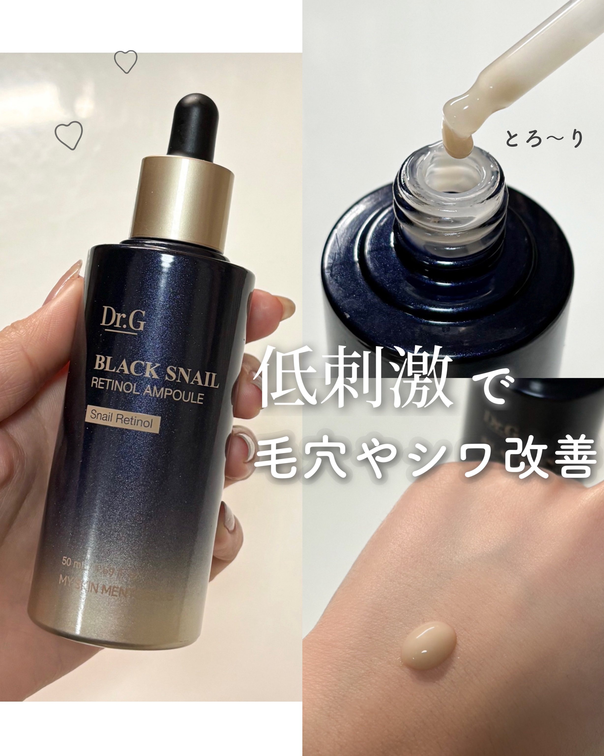 - ブラックスネイル*とレチノール*を配合した、若々しい肌印象に導く美容液です。 Dr.Gのレチノールは独自の成分である、ブラックスネイルレチノール*を使っています! 肌に高い保湿感を与え、肌のキメを整え、弾力やハリのケアを助けるだけでなく、肌の乾燥くすみをケアし、明るい印象のぷるんっとハリのある肌に導きます。 *整肌成分