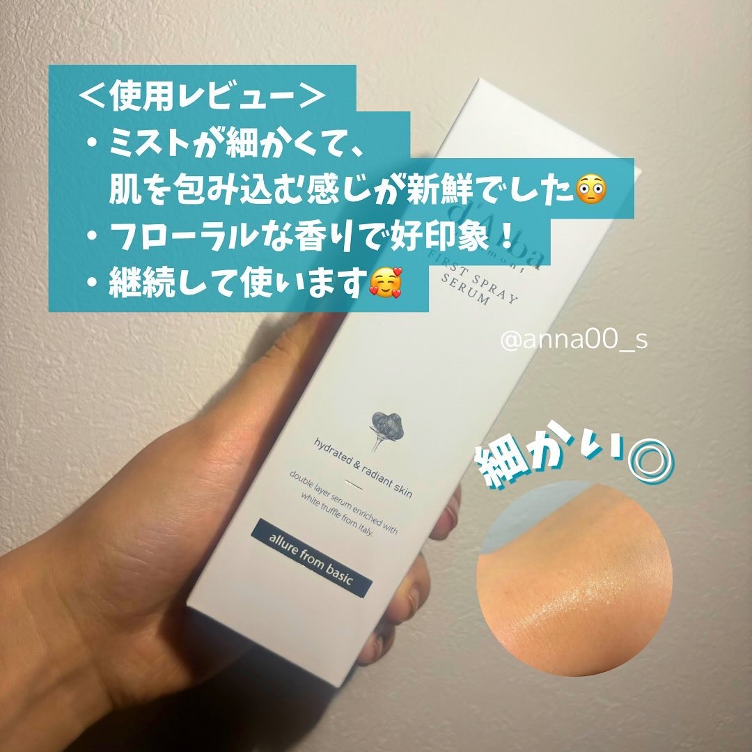 振って使う二層構造ミスト化粧水 ☑︎敏感肌も使える ☑︎シトラスフローラルの香り ダルバ独自の成分「トリュフェロール」配合 セラムオイル層+エッセンス層で二重保湿レイヤリング✨✨ 霧みたいなとっても細かいミストで保湿される💛 メイクの上からでも使いやすい!