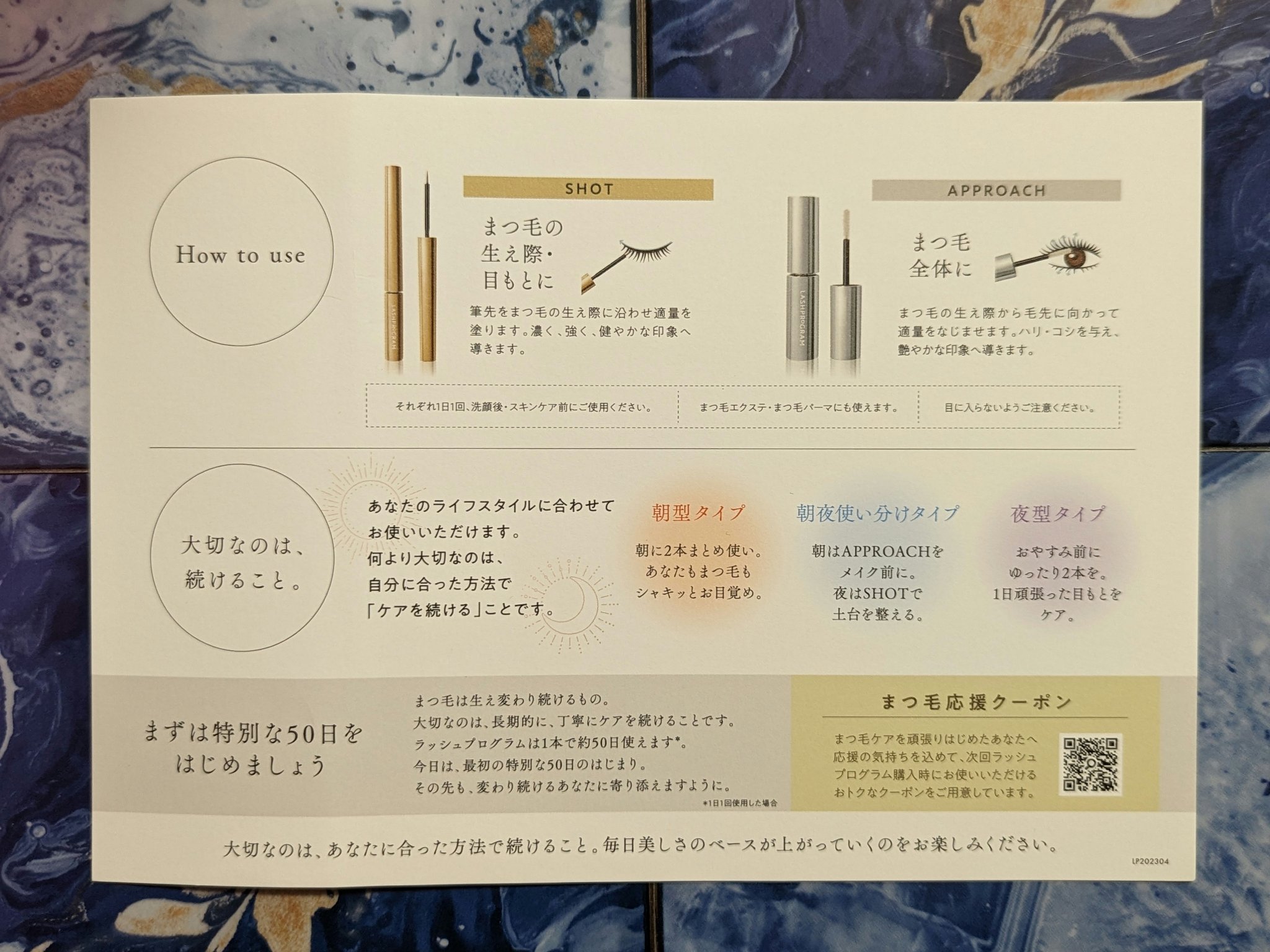 2本で1セットのまつ毛美容プログラムだそうです。まつ毛の生え際・毛先で2本を使い分け、それぞれの処方、使う箇所に適したアプリケーター設計になっているのです。 まつ毛・目もとのことを考えた美容液成分配合で、濃く、強く、健やかな印象に。まつ毛の生え際や細部までピンポイントに美容液を届けてくれます。 ハリ・コシを与え、艶やかな印象に。まつ毛全体に塗りやすく、毛流れも整える繊細ブラシで、マスカラのようにつけ易いです。