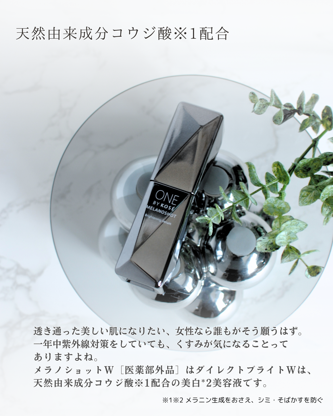 シミ発生源に直に効く 天然由来の美白有効成分 進化したみずみずしい浸透感 ワンバイコーセー メラノショット Wには美白有効成分の「コウジ酸」含まれている ほんの〜りとお上品で素敵な香り ほんのりオレンジ味のあるとろっとしたテクスチャーで、肌馴染みも良くていいです。