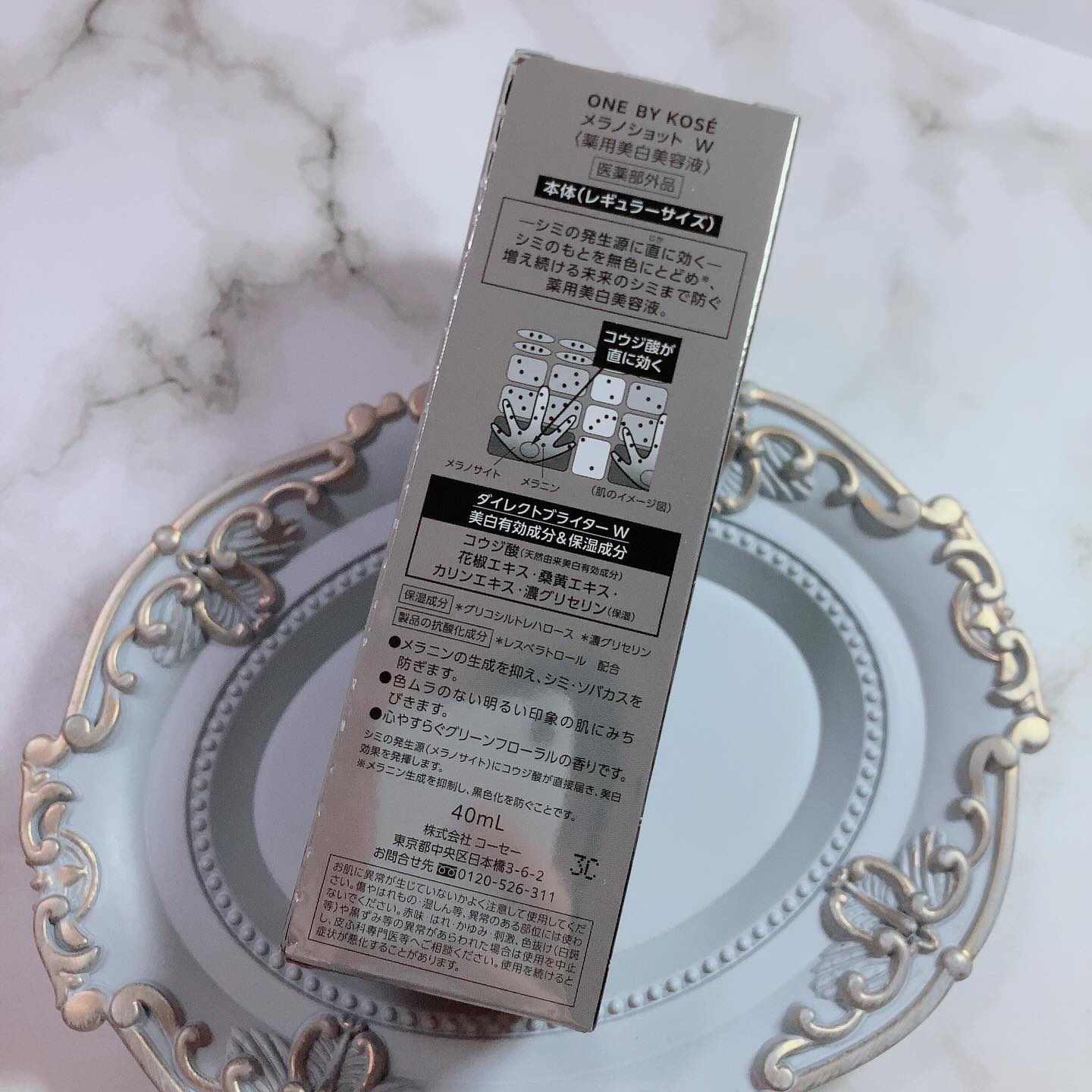 シミ発生源に直に効く 天然由来の美白有効成分 進化したみずみずしい浸透感 ワンバイコーセー メラノショット Wには美白有効成分の「コウジ酸」含まれている ほんの〜りとお上品で素敵な香り ほんのりオレンジ味のあるとろっとしたテクスチャーで、肌馴染みも良くていいです。