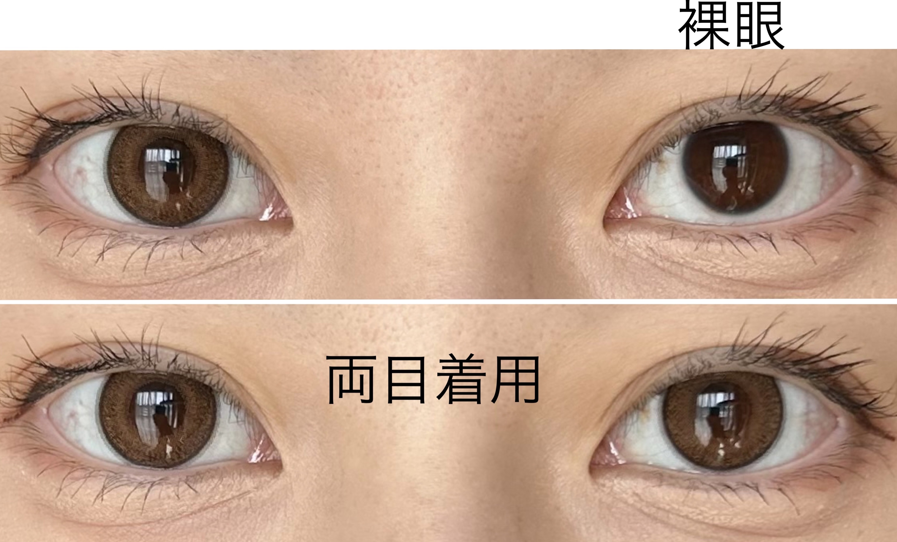 中の本当にココアみたいなくすみブラウンカラーが他には無い感じでじゅわーっとした発色が最高ですね 中のカラーが明るめでリング状になってると結構派手な感じになりやすいんですが、このじゅわっとした感じのおかげでそこまで派手だったりキツくは見えないです きゅるっと丸い目に見えて本当に可愛らしい印象になりつつ立体感がしっかり出て、写真盛れも現実盛れも間違いない気がします