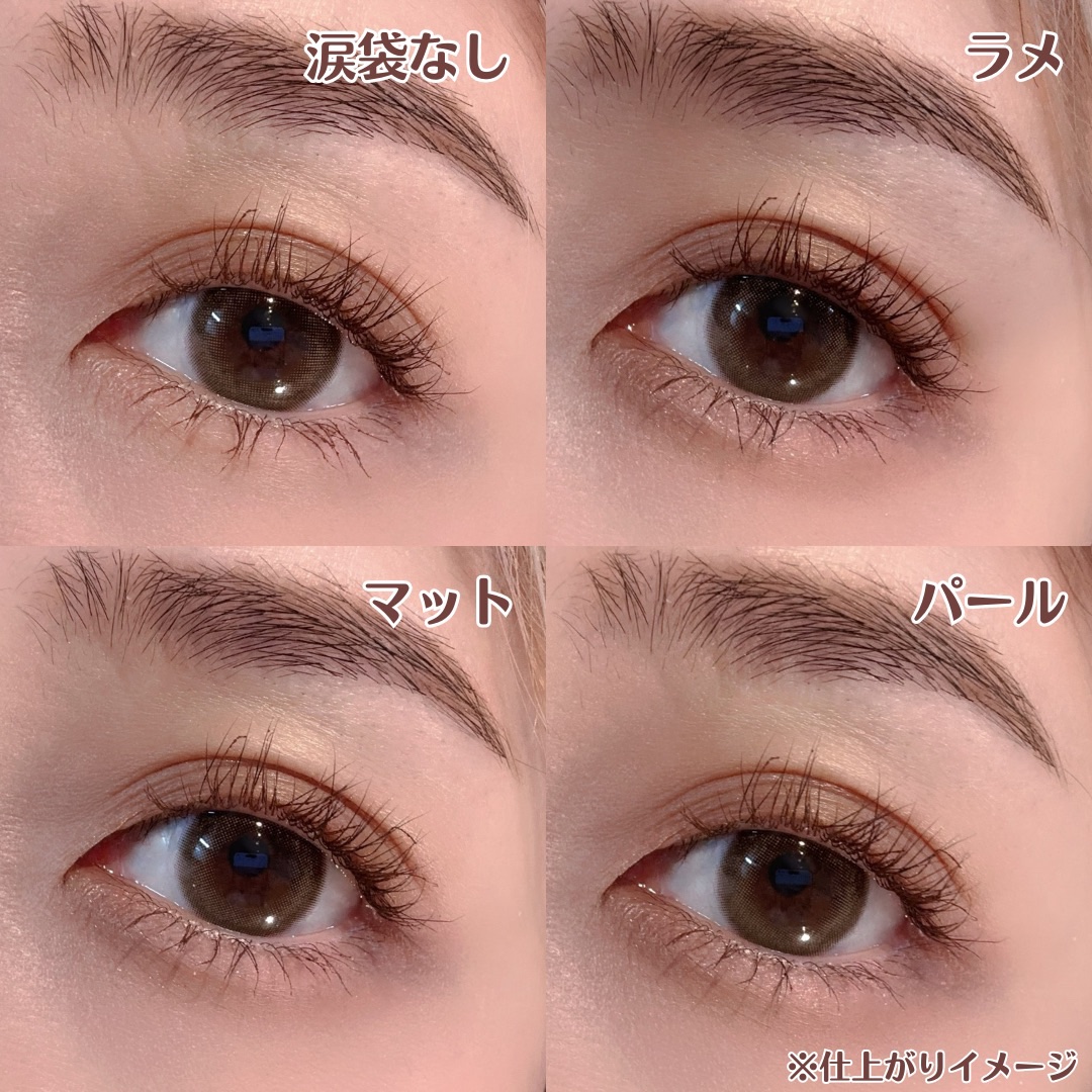 - マット・パール・ラメ入りで3パターンの涙袋が作れる 涙袋用アイシャドウパレット 涙袋用に3色、涙袋の影用に1色がセットされた涙袋用のアイシャドウパレットです。 その日の気分やTPOに合わせて選んでみてくださいね! マットは透け感があり目元のシワが気になりにくく、 パールは繊細で透明感のあるツヤっとした仕上がりに、 ラメはキラキラと輝く透け発色です。 涙袋の影用の「血色影カラー」は、影寄りの色なのに血色感もあって目元が暗くならない パウダーだからこそできた絶妙な色味なんです!