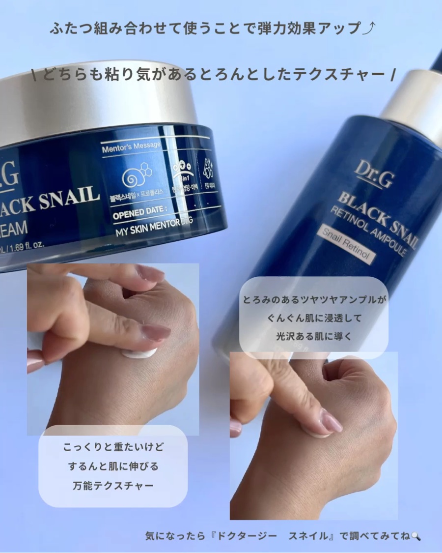 ブラックスネイルと低刺激のレチノールを配合した美容液 とろみがあってミルキーなテクスチャー なめらかにすべるように伸びて気持ちいい使用感で好き ブラックスネイル20%配合クリーム もっちりとした弾力を感じるテクスチャー なめらかに伸びてべたつかない Dr.Gが開発した独自成分のブラックスネイルレチノールは刺激が少なく効果的◎ アトピーもちの敏感肌、乾燥肌だけどトラブルなく使えてるよ♪